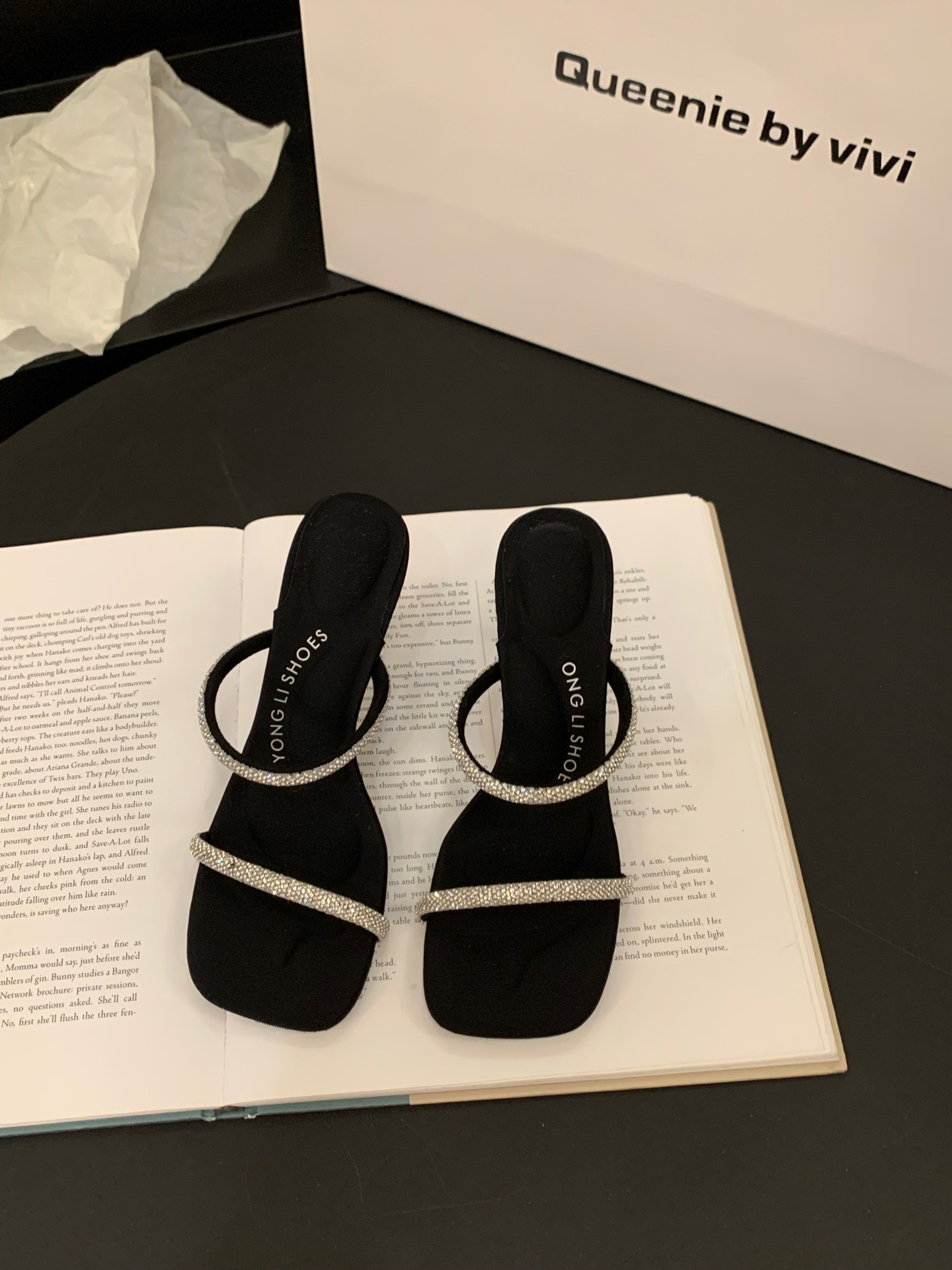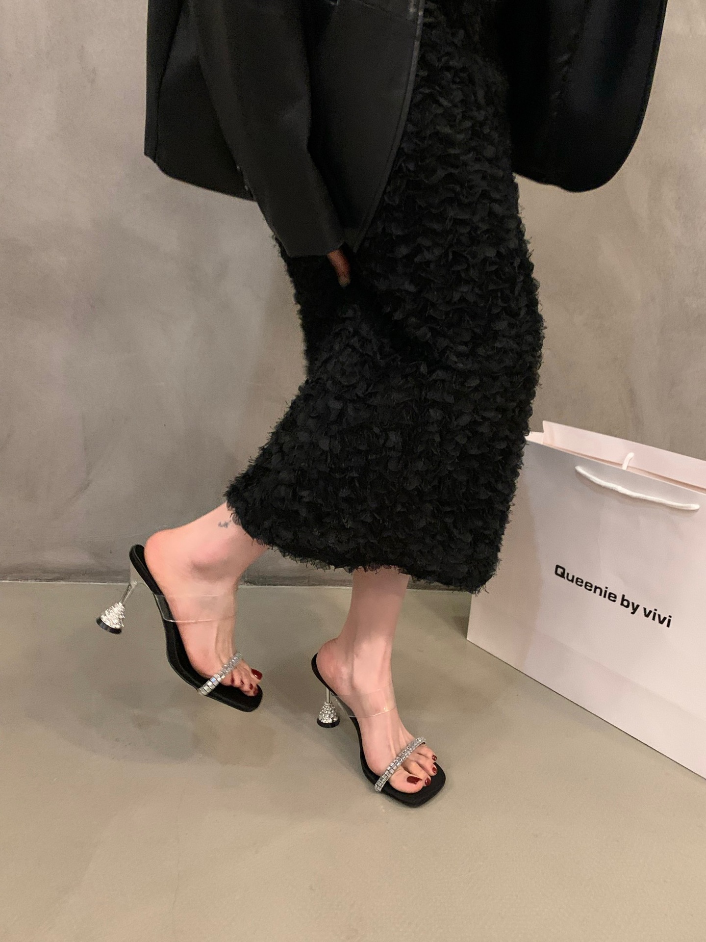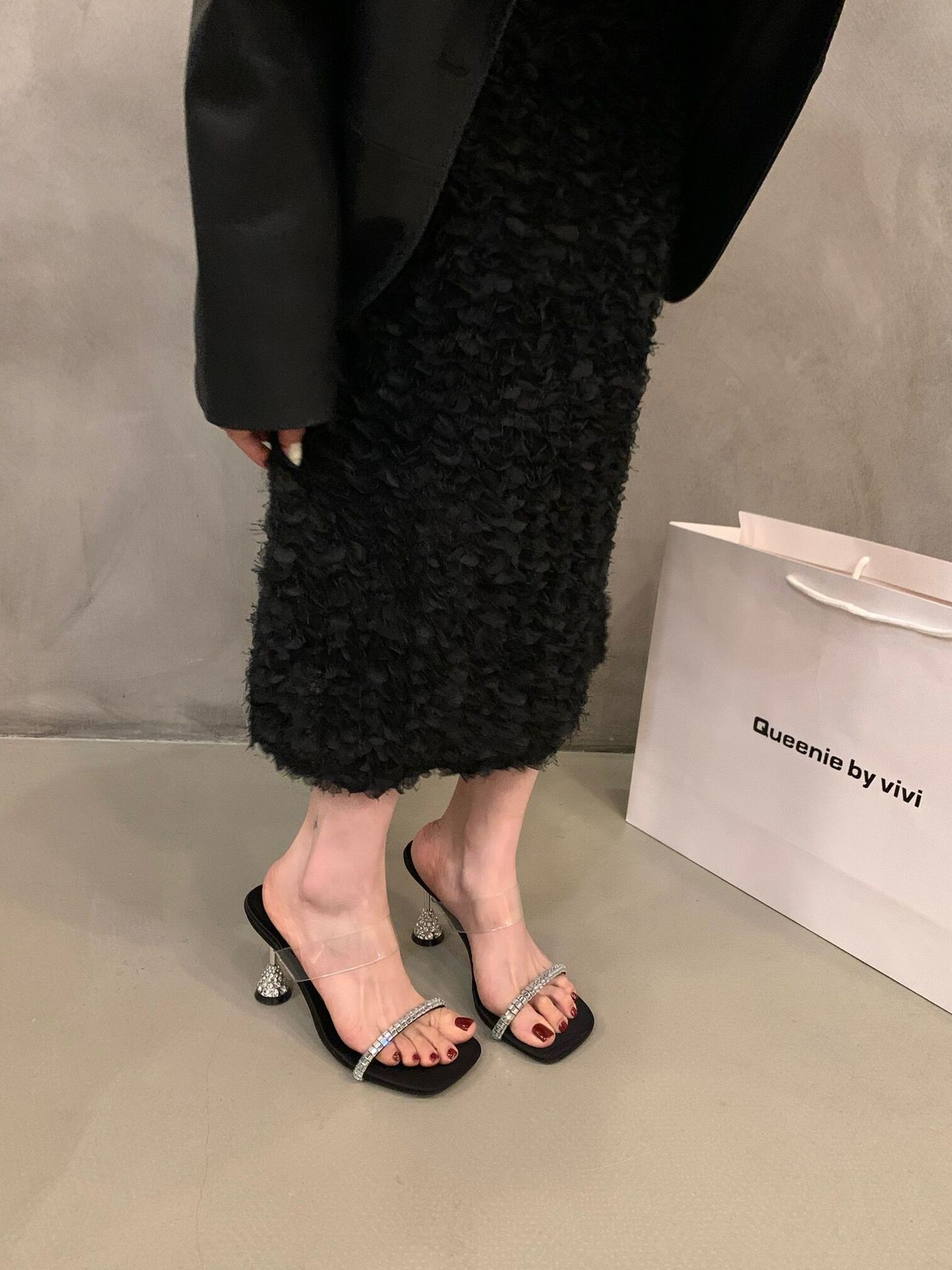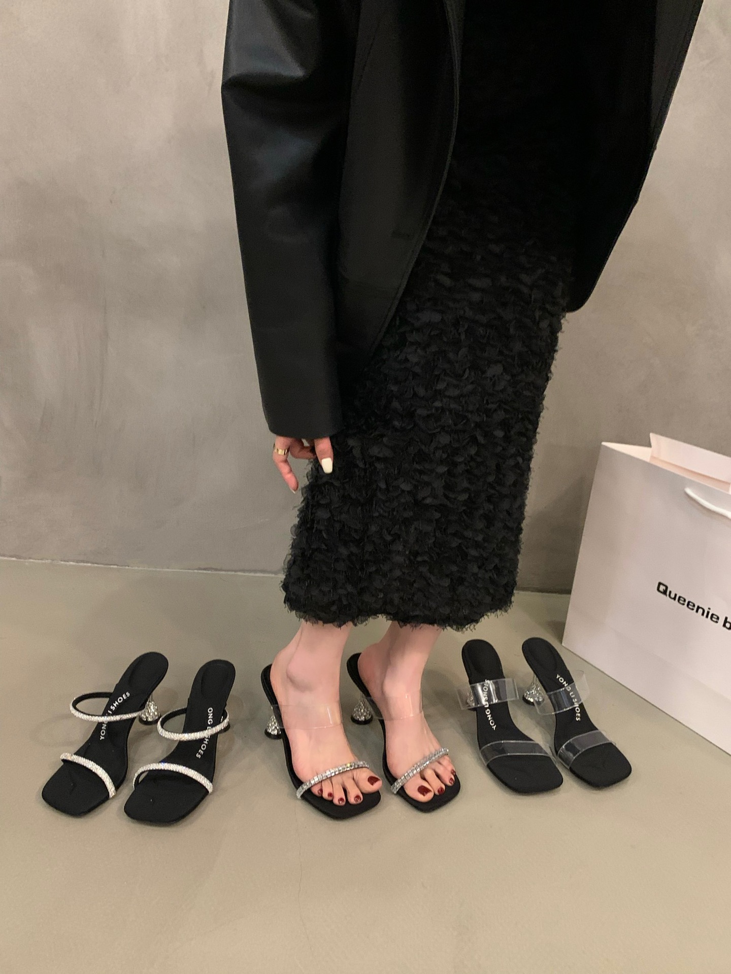 法式拖鞋女外穿新款秋季细跟方头透明一字拖高跟鞋