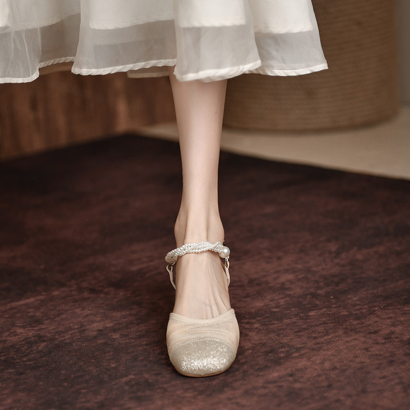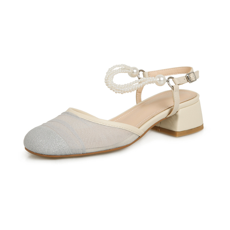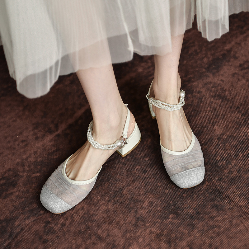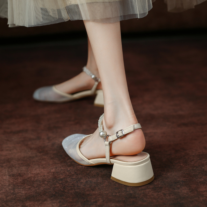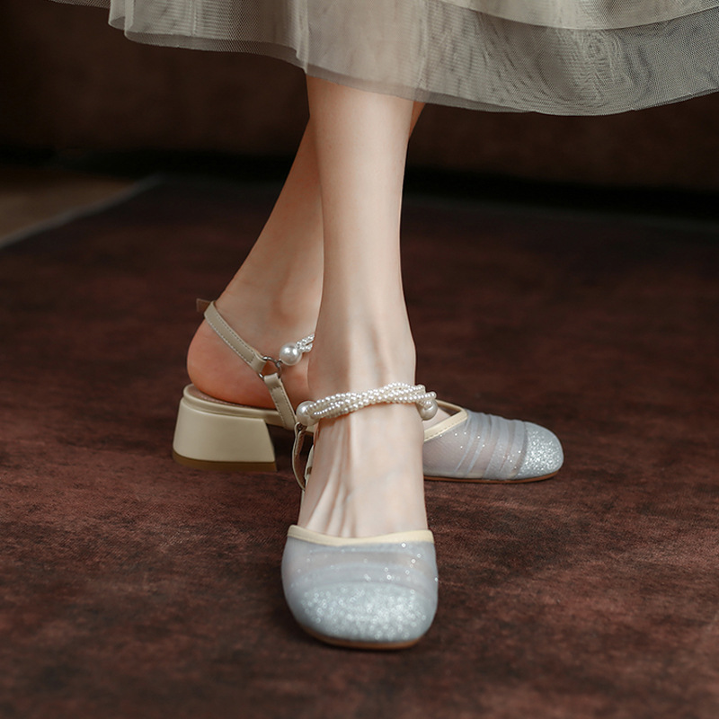 夏季新款~亮片珍珠网纱包头凉鞋女仙女风气质粗跟