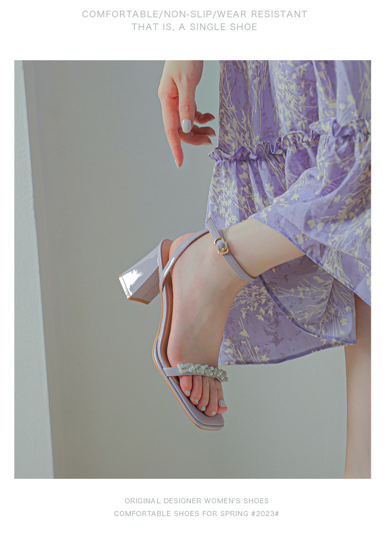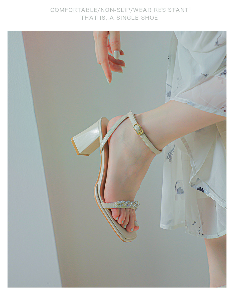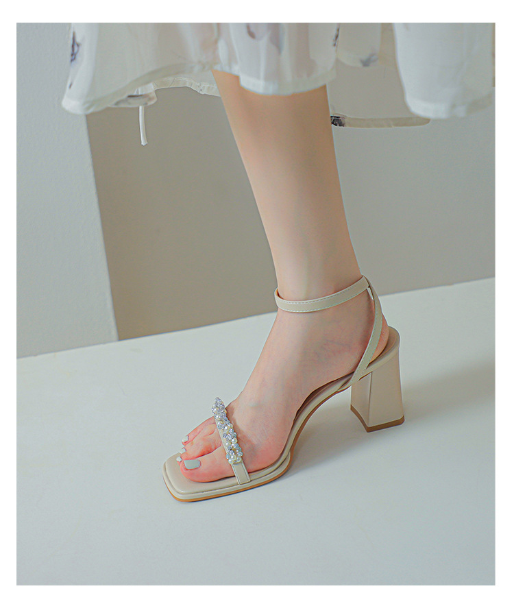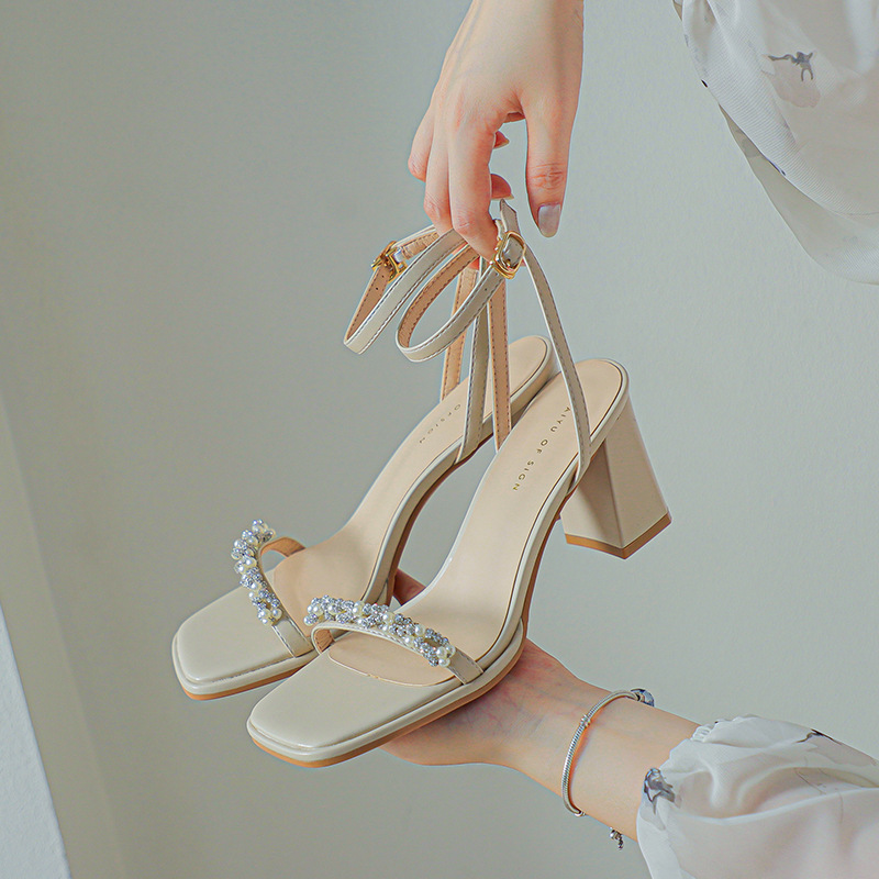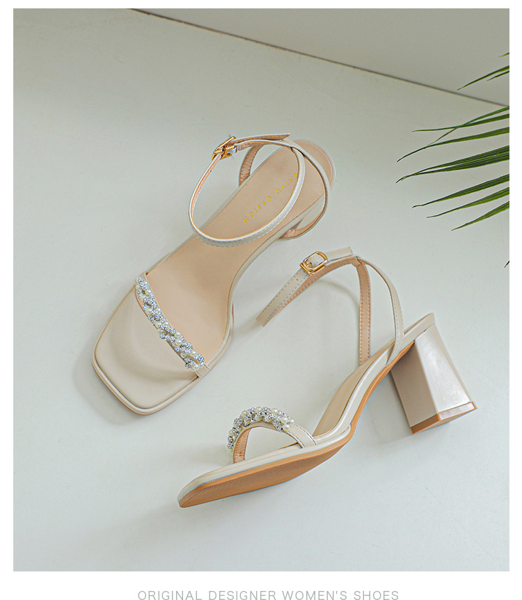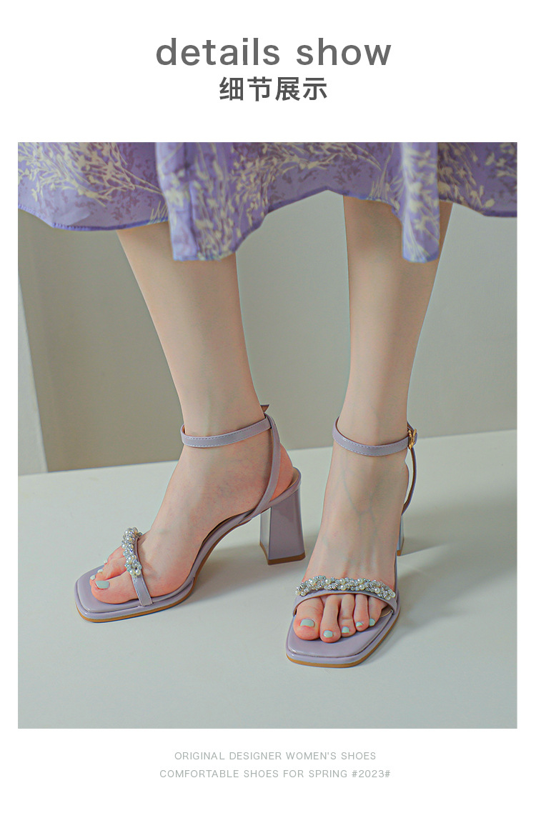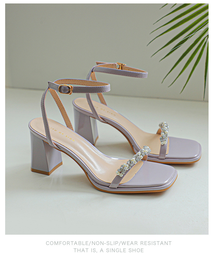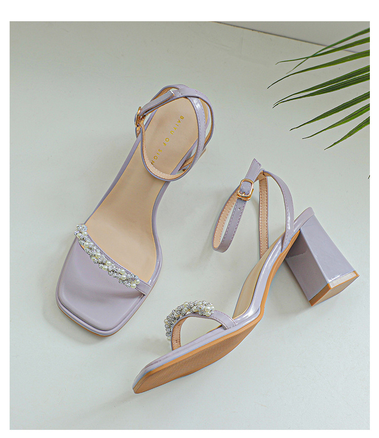 白色粗跟凉鞋女夏天珍珠水钻露趾方头外穿一字扣带紫色高跟鞋方根