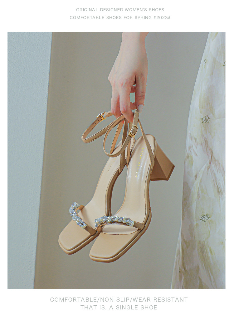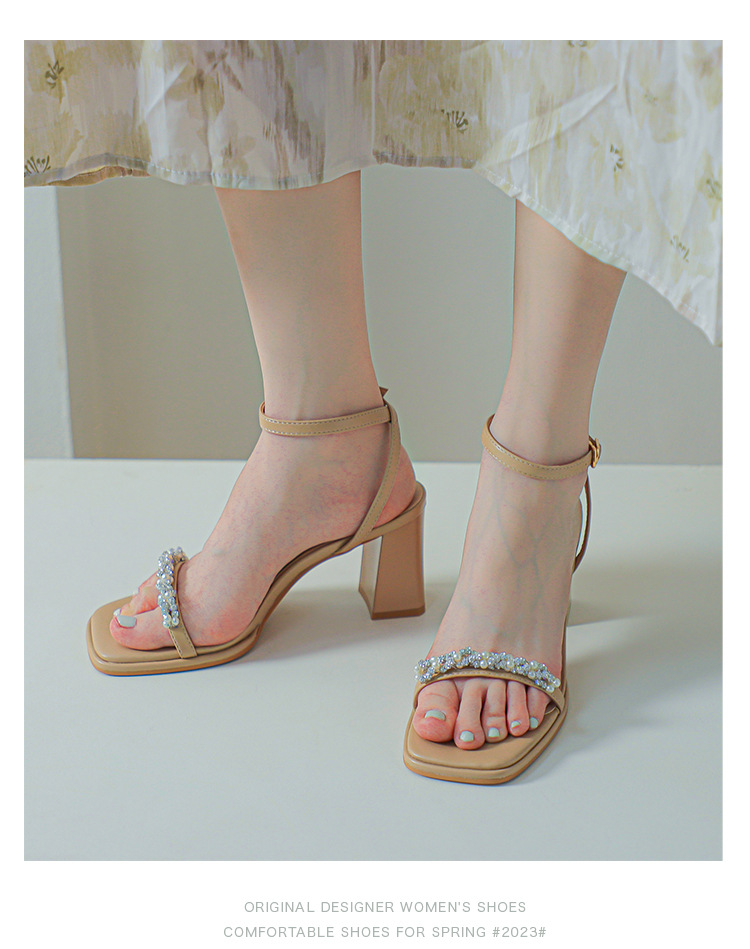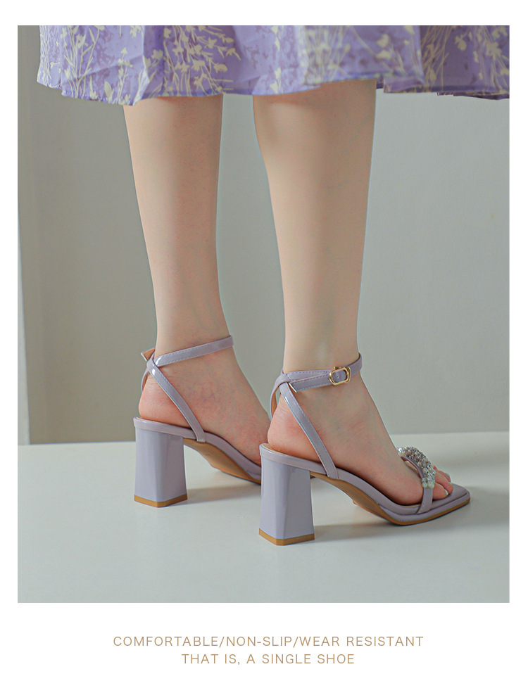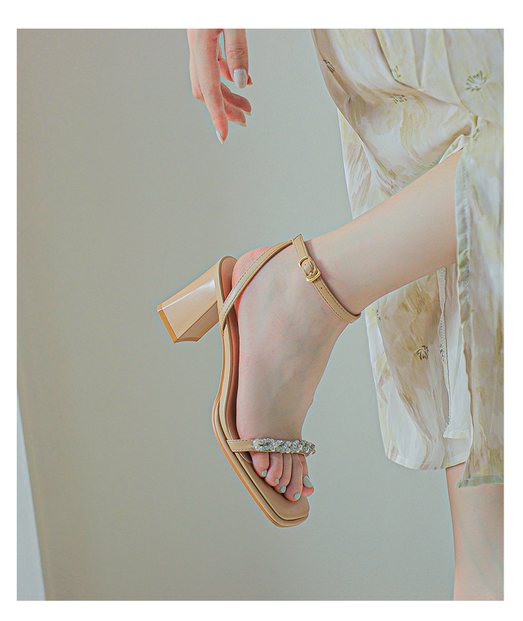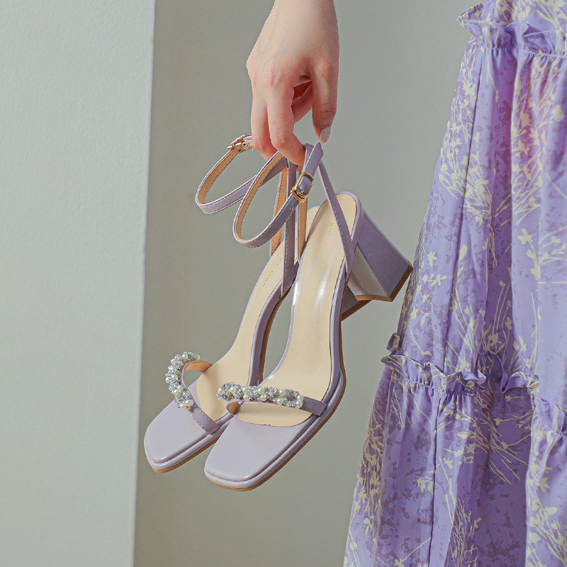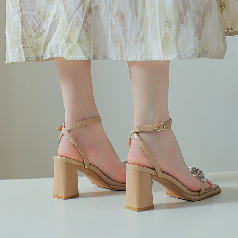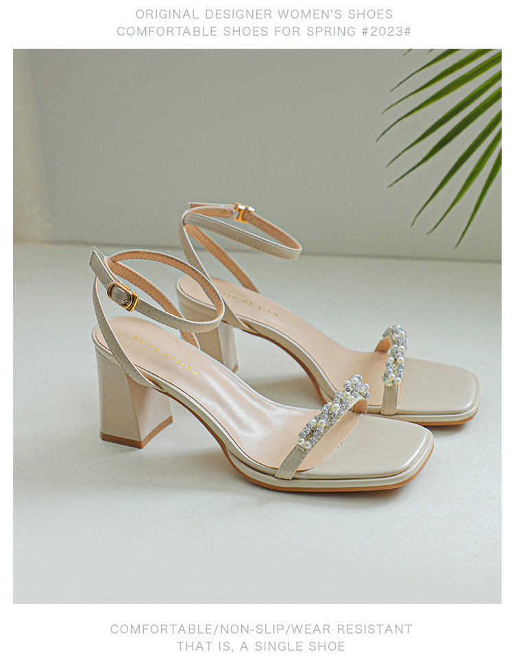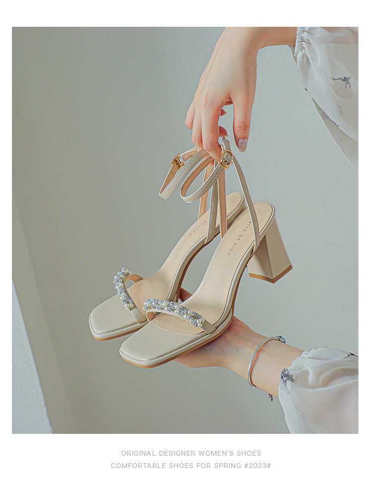 白色粗跟凉鞋女夏天珍珠水钻露趾方头外穿一字扣带紫色高跟鞋方根