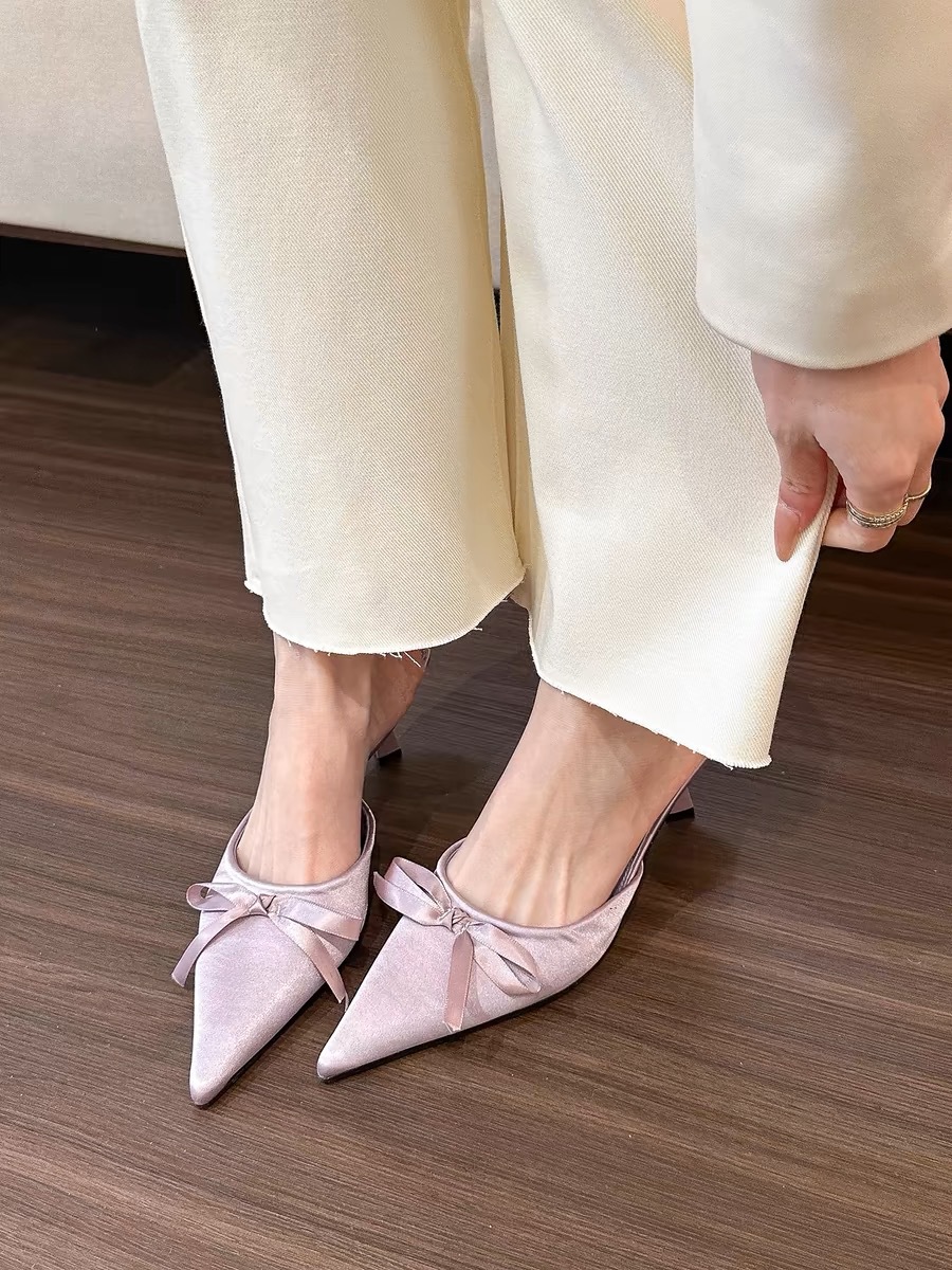 美到心坎!香芋紫尖头半拖鞋女外穿蝴蝶结细跟高跟鞋