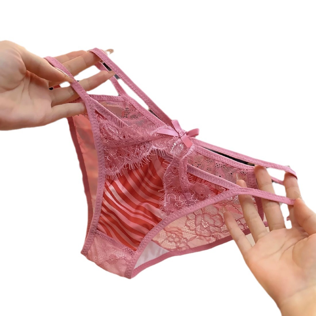 多巴胺玫红内裤女士斑马镂空印花蝴蝶结透明三角裤蕾丝性感低腰