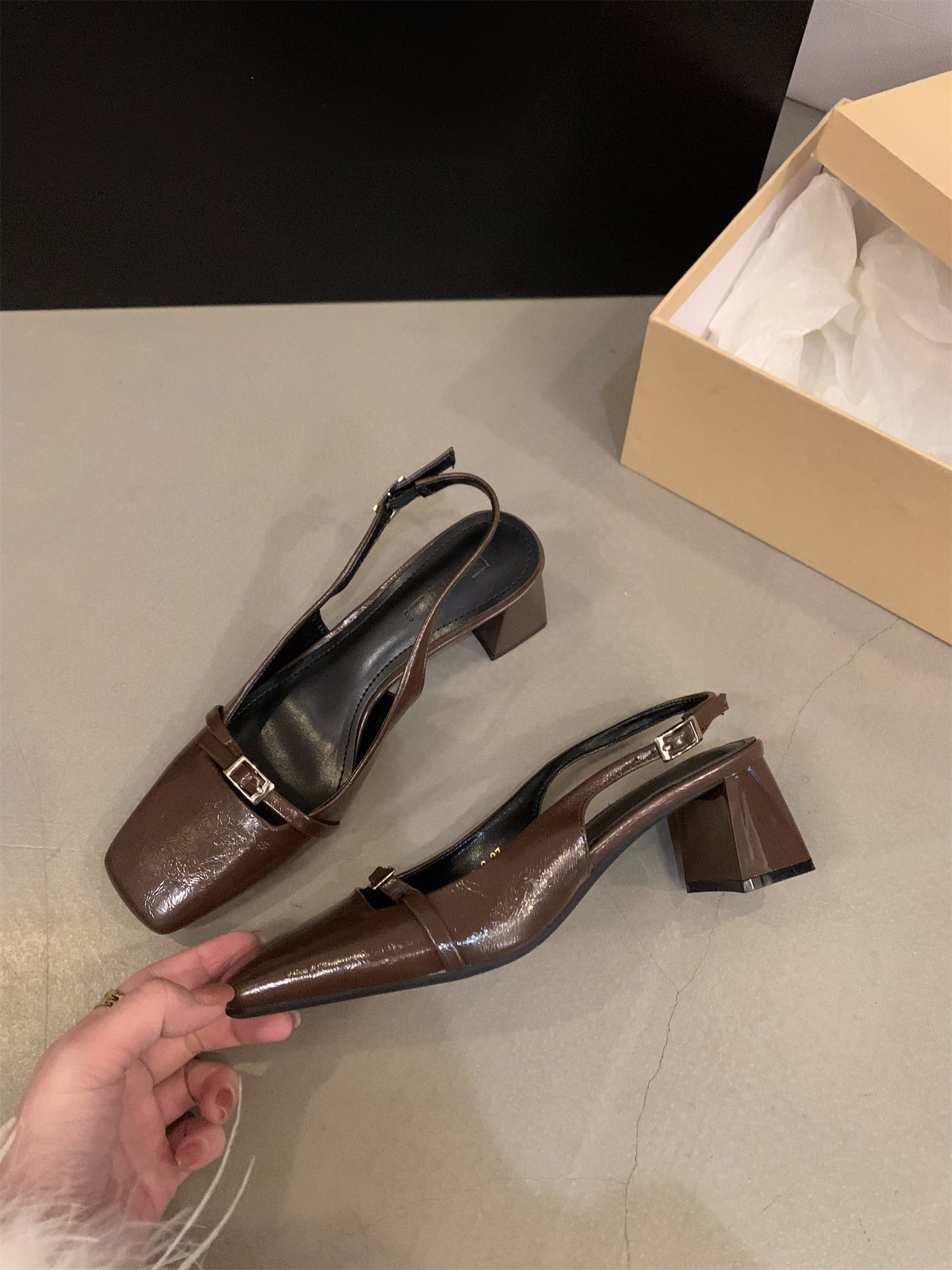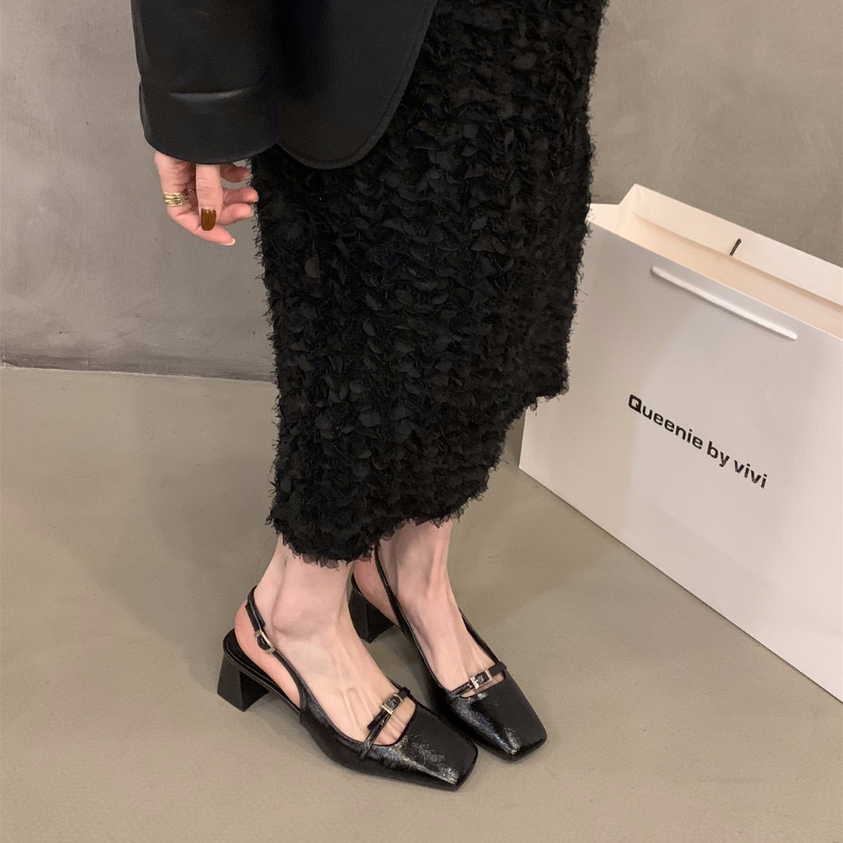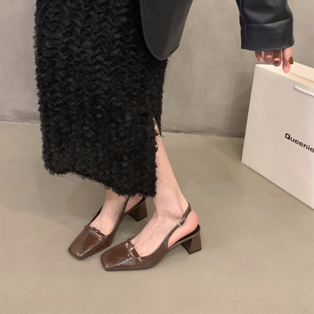 法式粗跟高跟鞋黑色包头凉鞋仙女鞋子新款春夏季方头后空单鞋