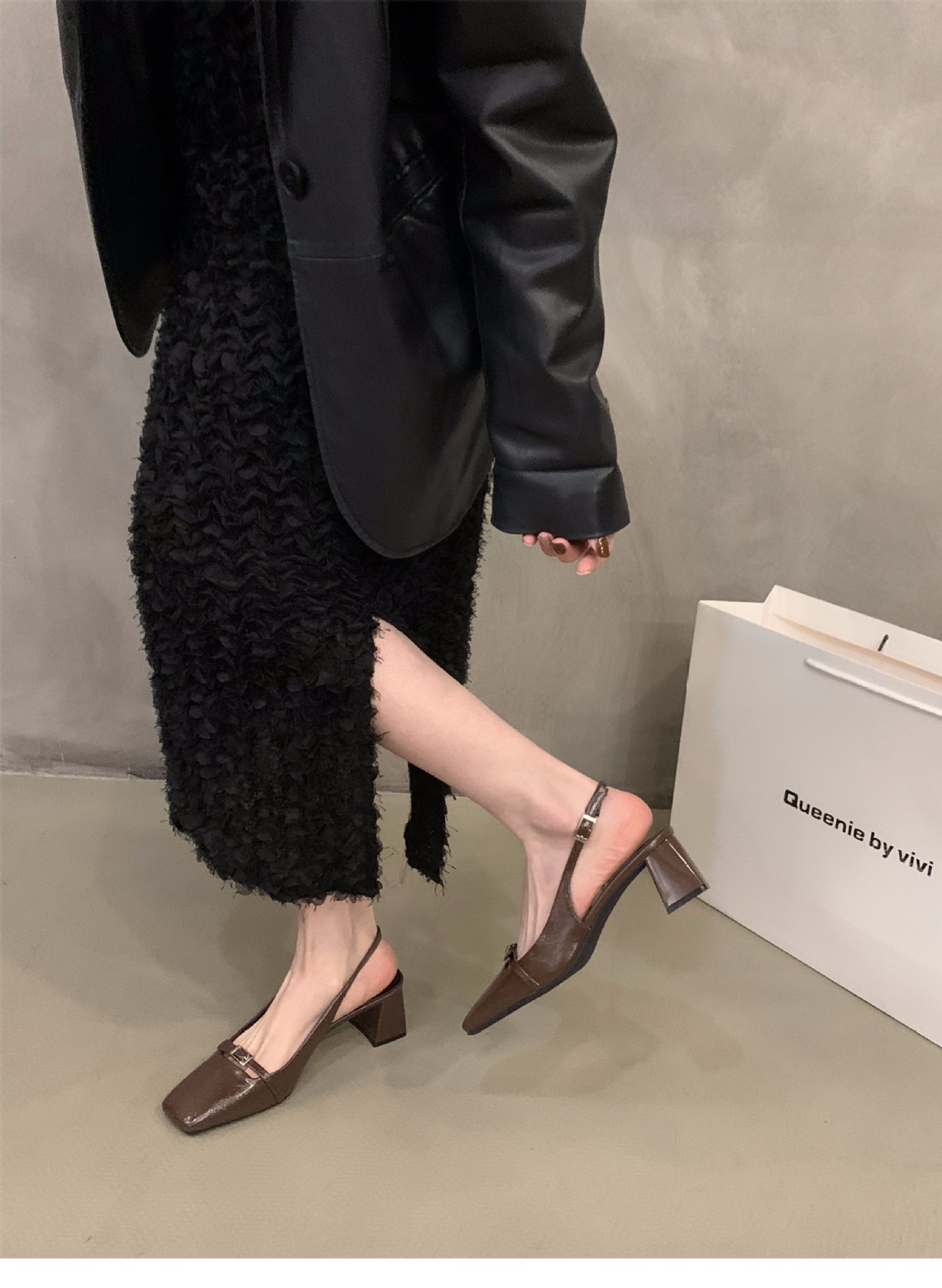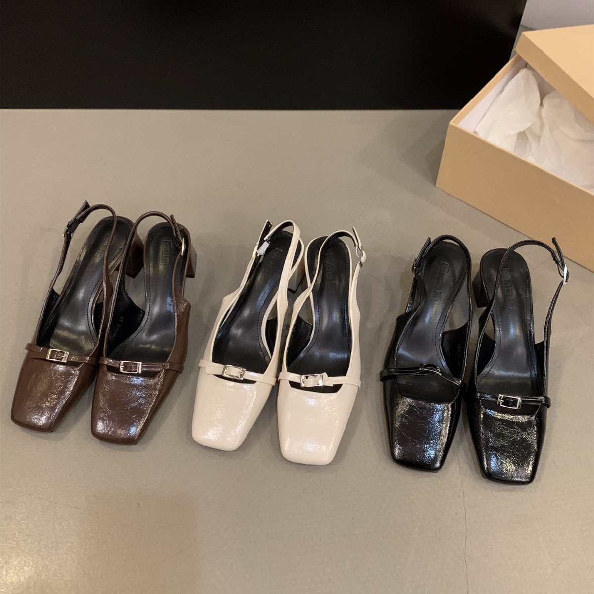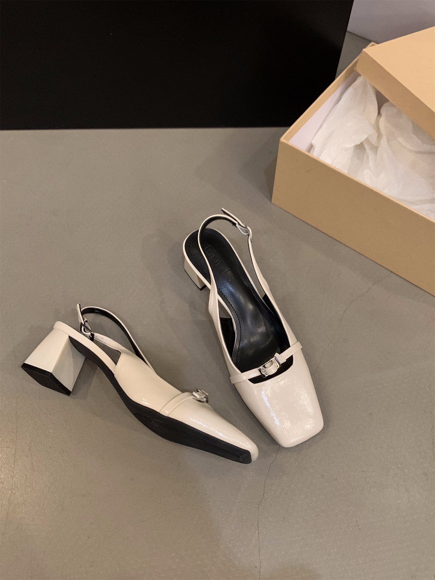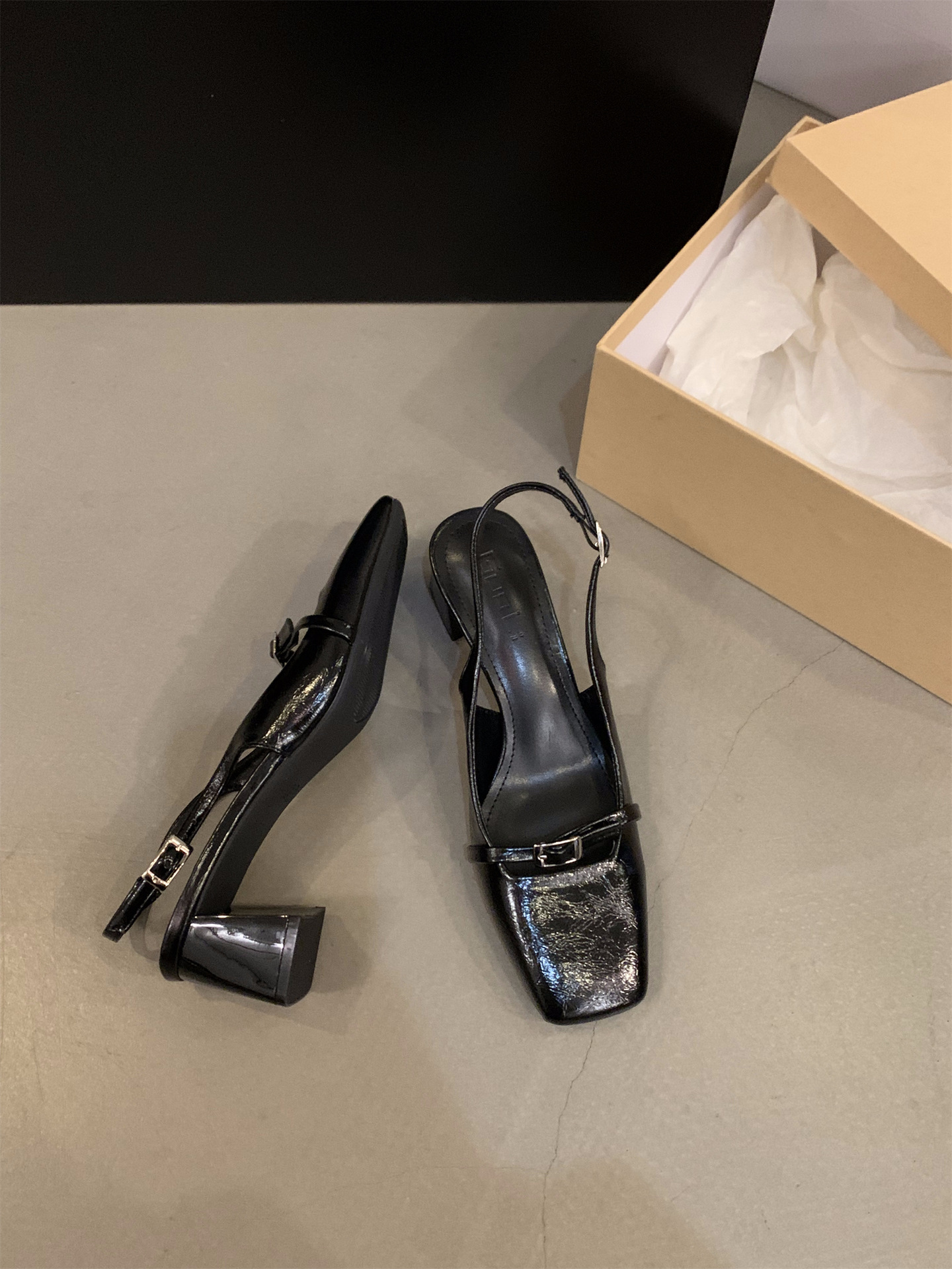 法式粗跟高跟鞋黑色包头凉鞋仙女鞋子新款春夏季方头后空单鞋