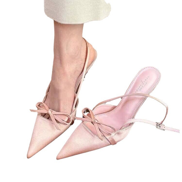 清冷温柔!银色尖头蝴蝶结凉鞋女夏季一字细跟高跟鞋