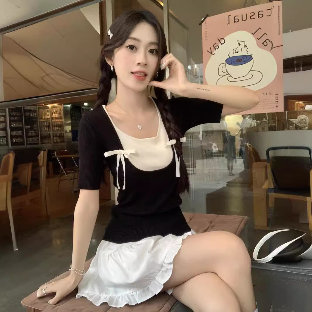 法式芭蕾风蝴蝶结针织短袖t恤女夏季小个子假两件撞色甜辣妹上衣