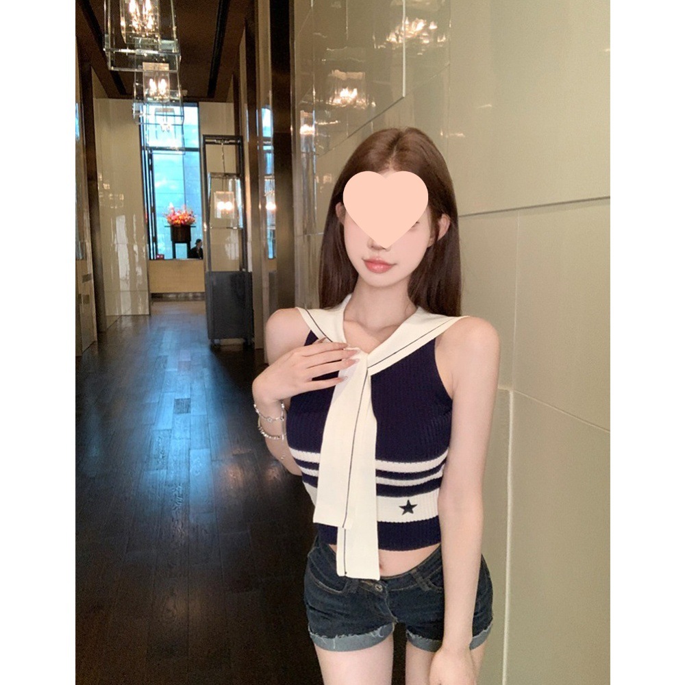 美式小众海岛假日蓝白条纹海军领飘带修身高腰背心针织无袖上衣女