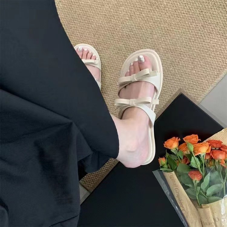 甜美气质简约一字带蝴蝶结银色露趾外穿凉拖鞋女新款