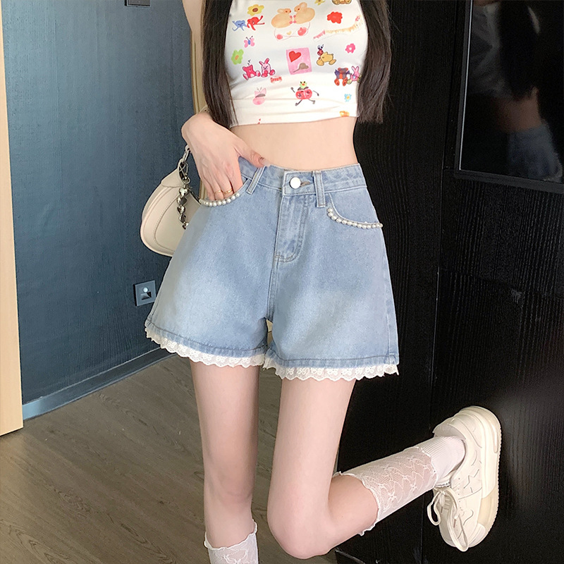 甜辣chic牛仔短裤女夏季高腰显瘦阔腿A字大码百搭小个子钉珠花边
