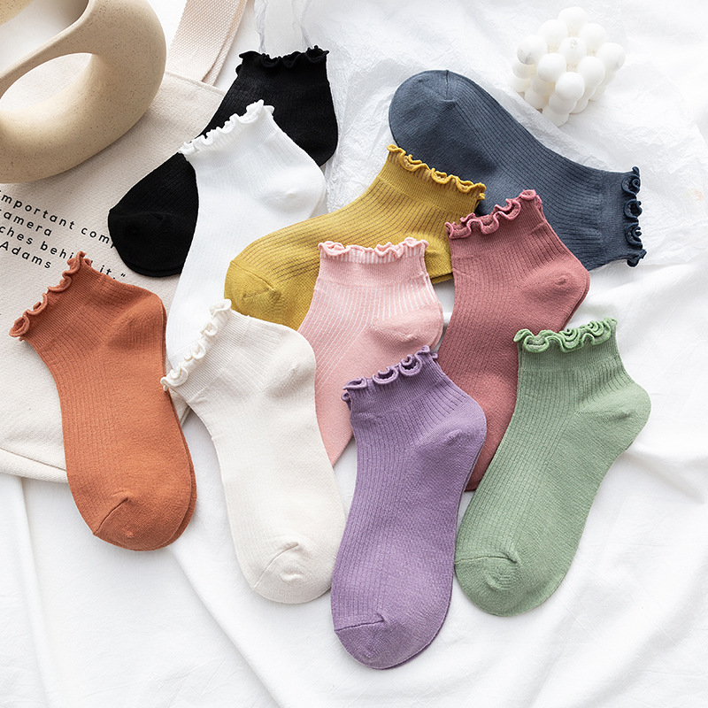 袜子女春夏木耳边松口女袜百搭糖果色纯色短袜潮流花边船袜女棉袜