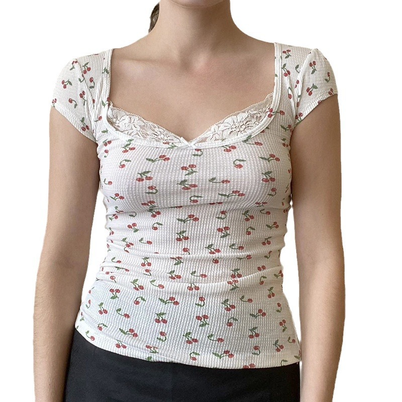 甜美风樱桃碎花蕾丝拼接胸型方领T恤少女撞色修身轻薄短上衣