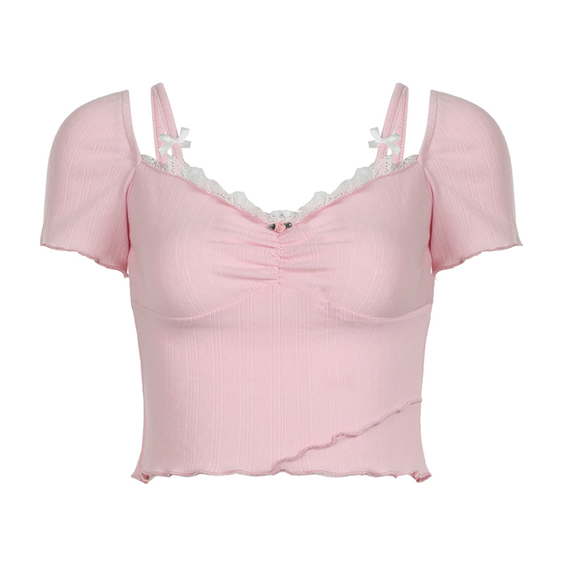 春夏美式方领蕾丝花边短袖T恤女甜美褶皱分割木耳边吊带上衣