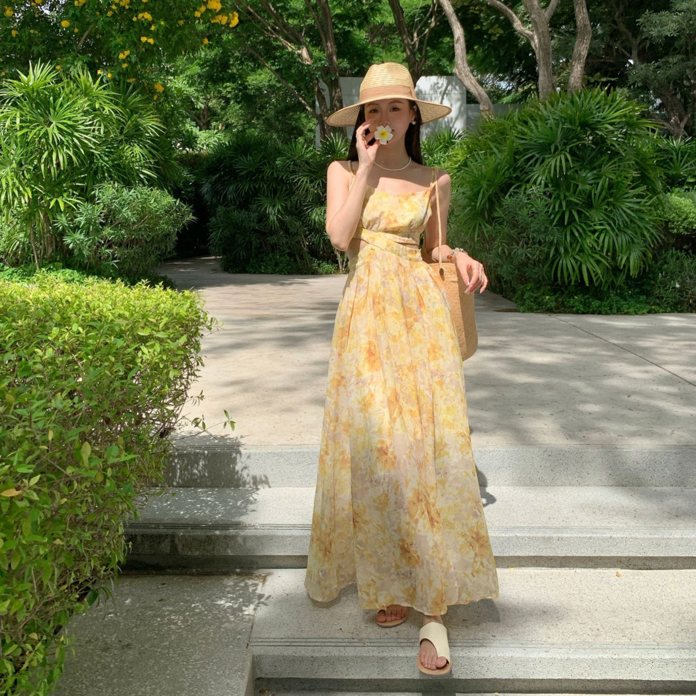 海边度假连衣裙法式茶歇小众露腰黄色碎花吊带沙滩裙拍照大摆长裙