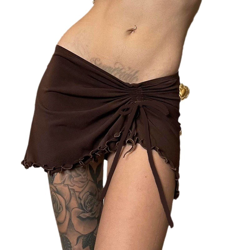 甜辣风V字腰头木耳边显瘦半裙女修身抽褶系带不规则超短裙