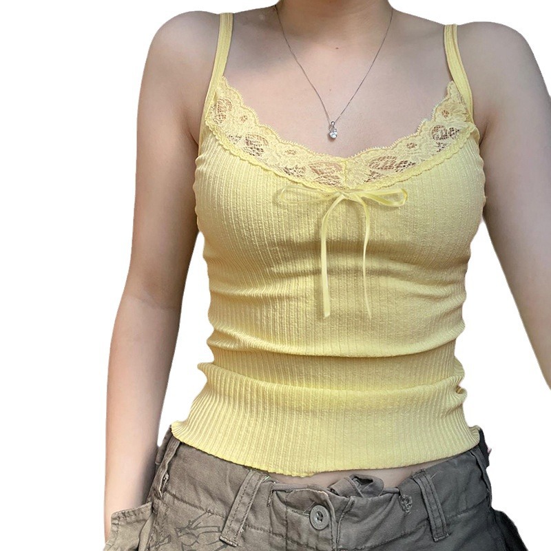 夏季纯欲风蕾丝花边拼接V领小吊带蝴蝶结系带坑条针织短上衣