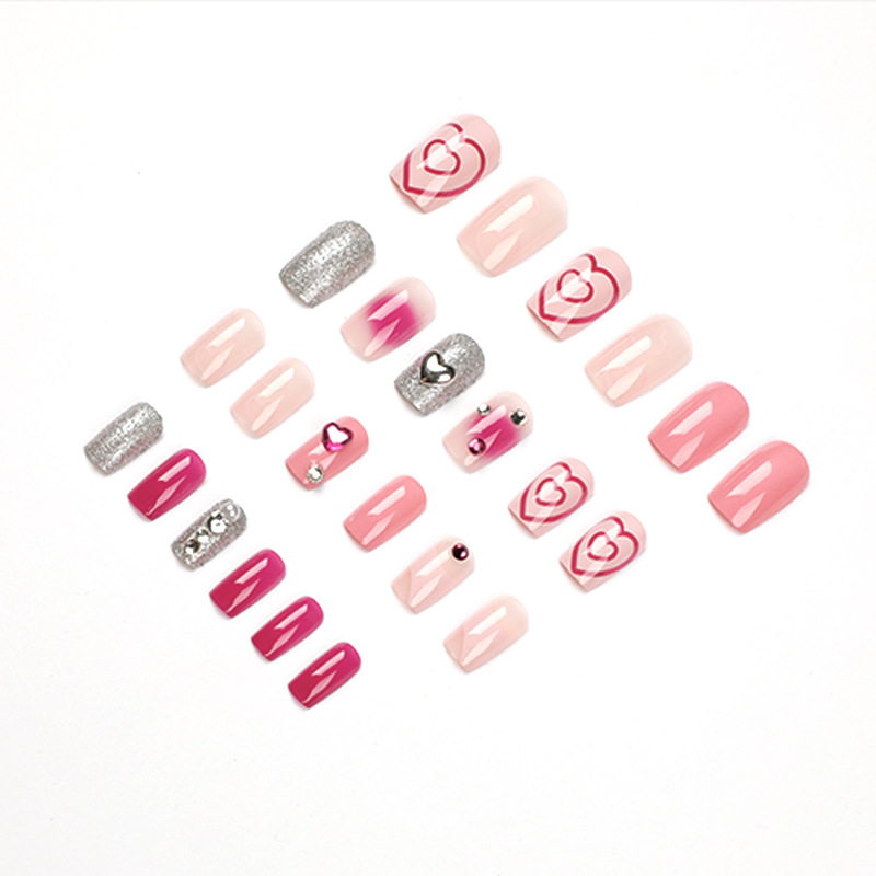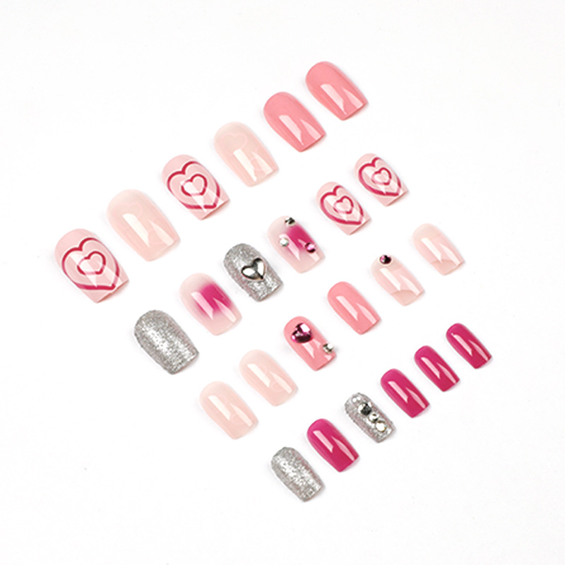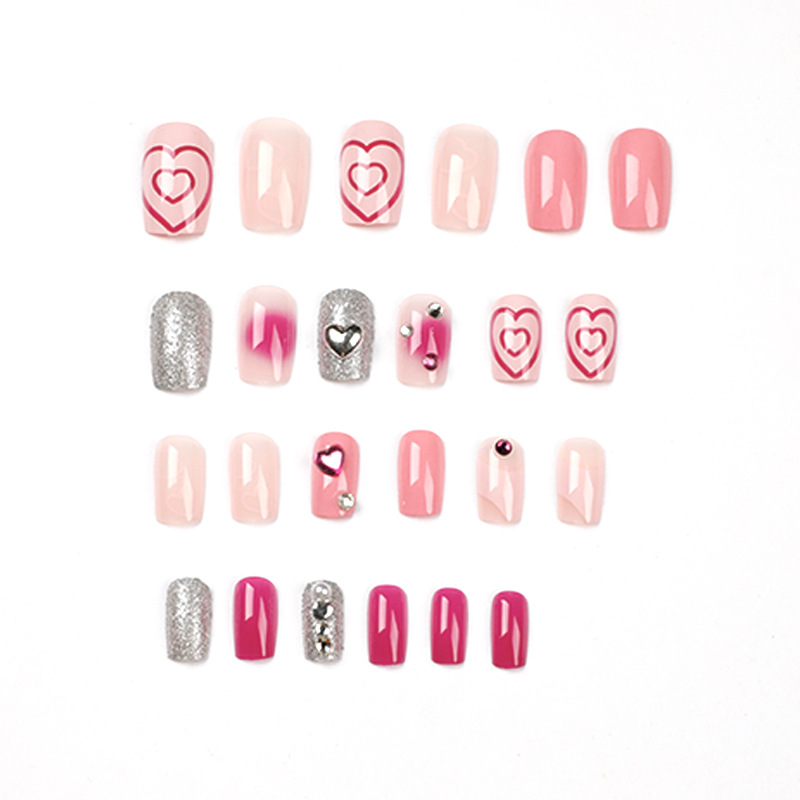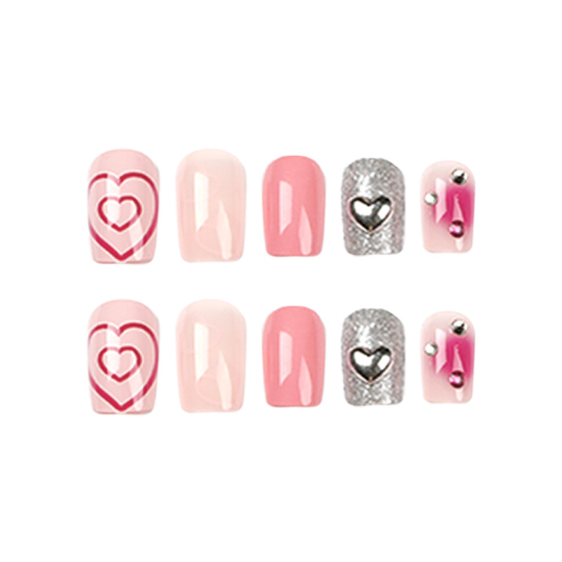 穿戴甲短款腮红银色金属爱心假指甲片银色闪粉美甲贴片