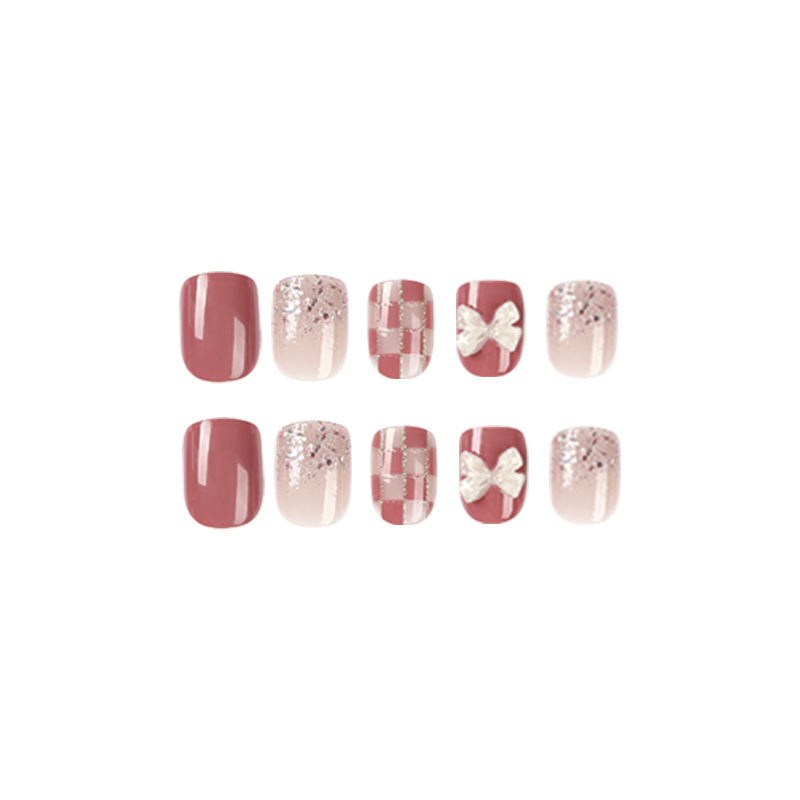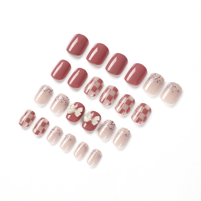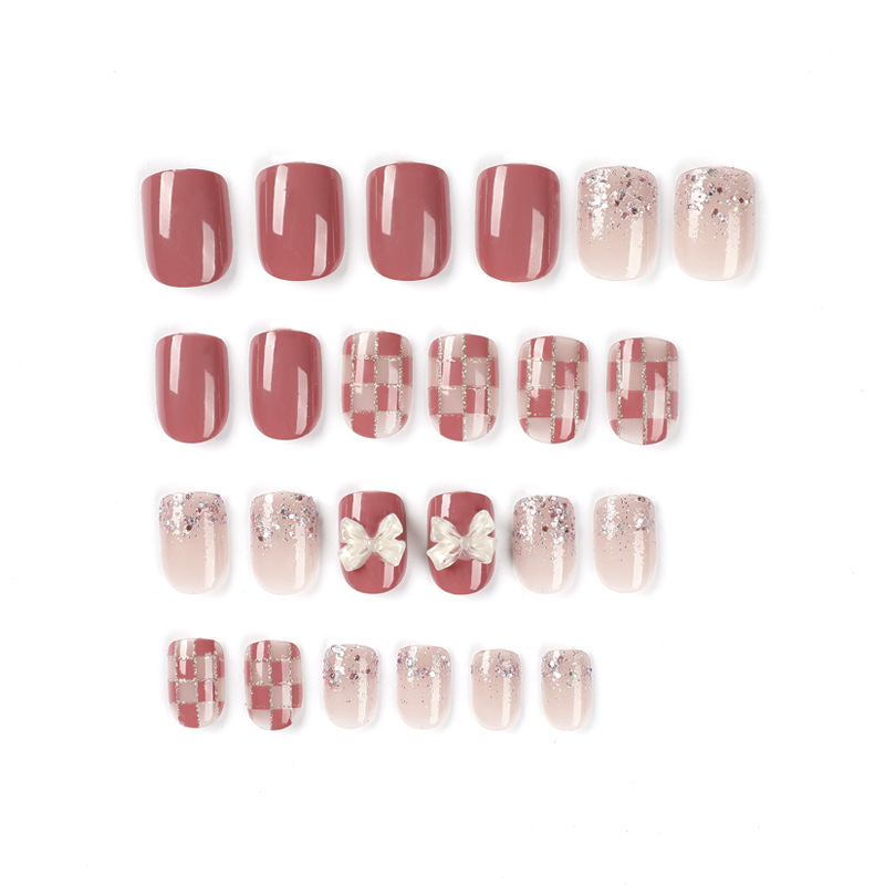 穿戴甲甲片蝴蝶结粉色棋盘格闪粉美甲穿戴甲ins风穿戴甲成品
