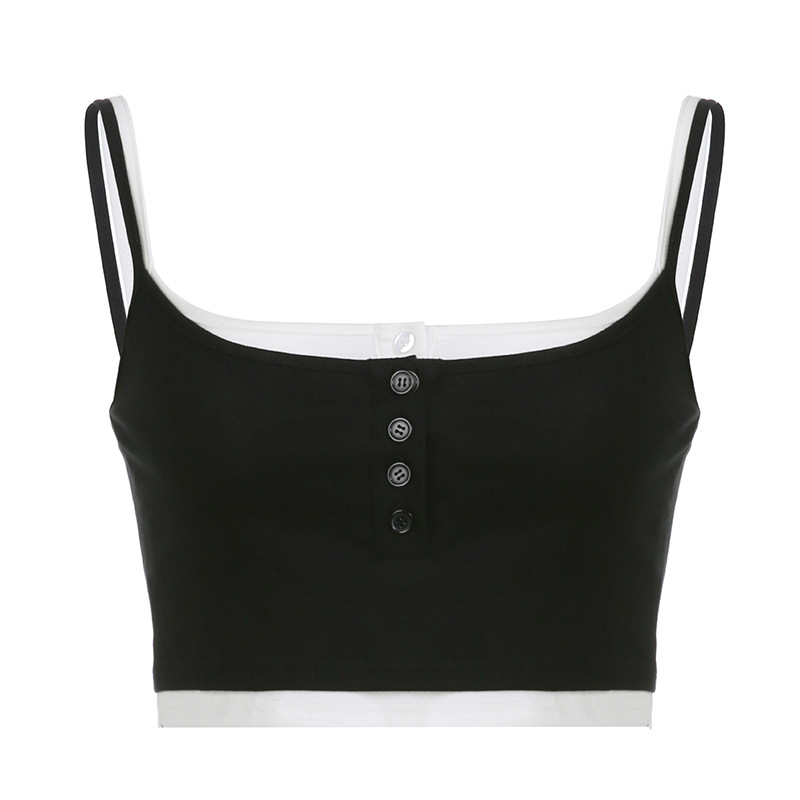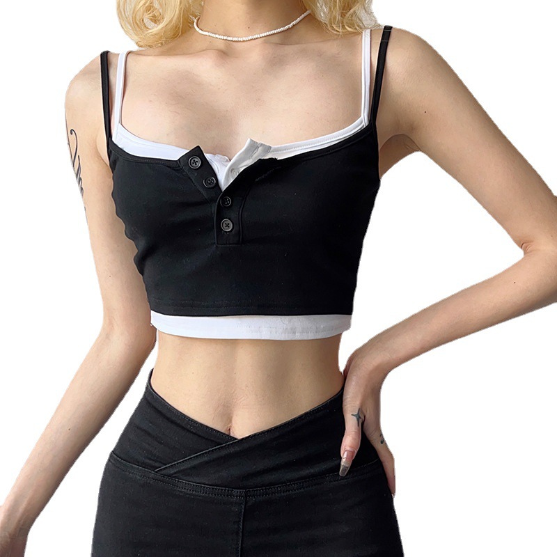 夏季欧美辣妹撞色修身假两件上衣基础休闲排扣短款露脐小背心