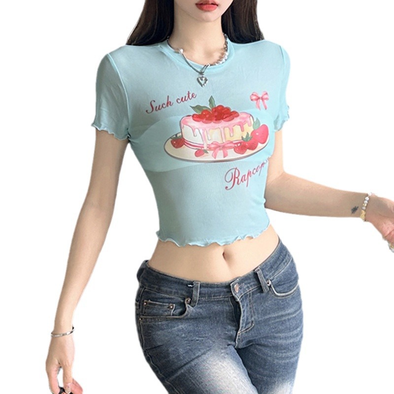 夏季新款蛋糕印花透视网纱T恤女辣妹修身木耳边露脐轻薄上衣