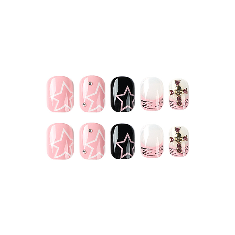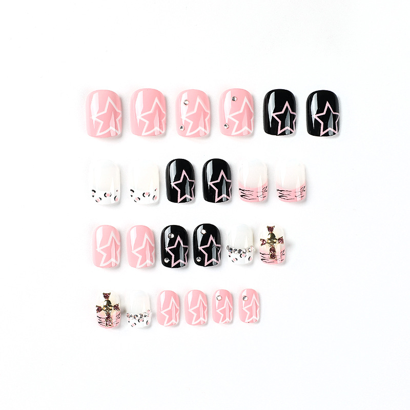 穿戴甲甲片法式粉黑豹纹可爱星星短款穿戴甲水钻十字架甲片