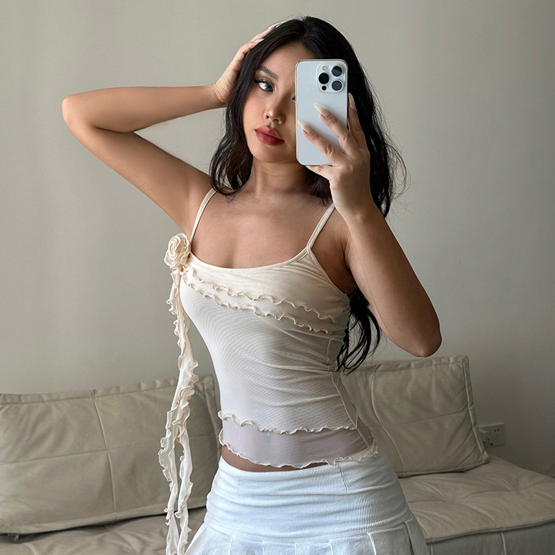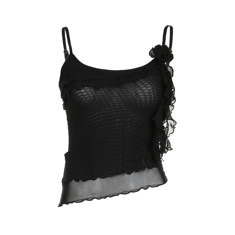 新款欧美辣妹风立体花朵荷叶边拼接不规则网纱纯色吊带背心夏