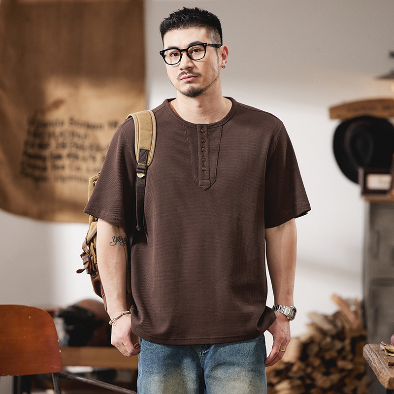 美式复古225G华夫格短袖t恤男亨利领衫宽松夏季薄款透气硬汉穿搭