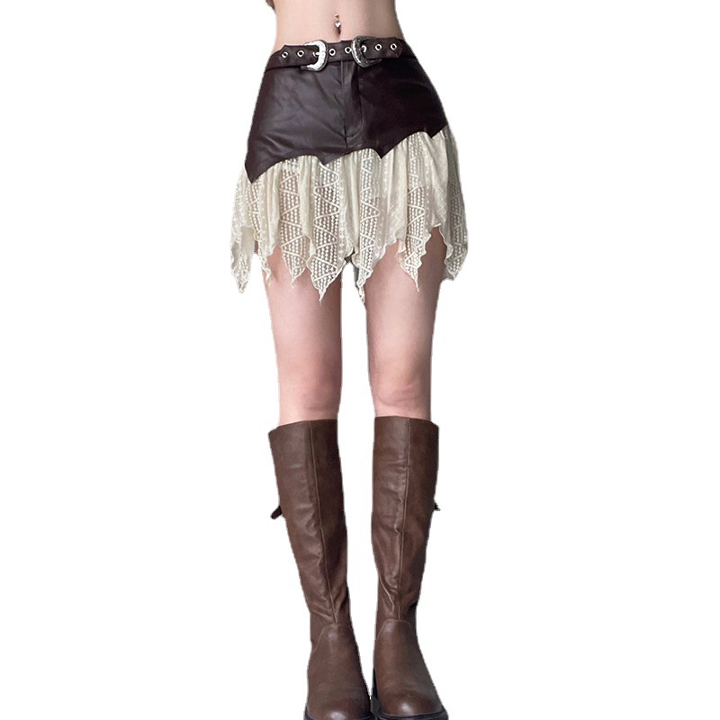 ins美式辣妹一片式蕾丝拼接皮半裙女低腰个性腰带修身显瘦百褶裙