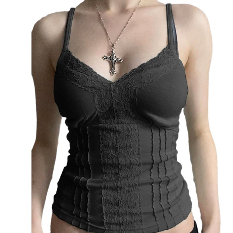 欧美潮流蕾丝花边拼接V领小吊带女纯色修身分割基础基础上衣