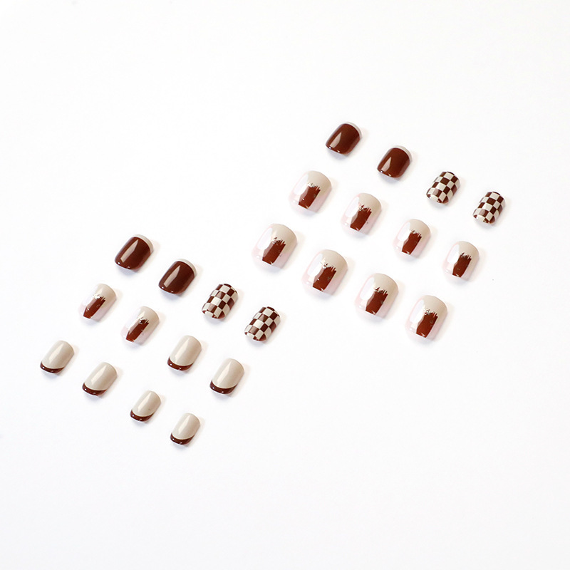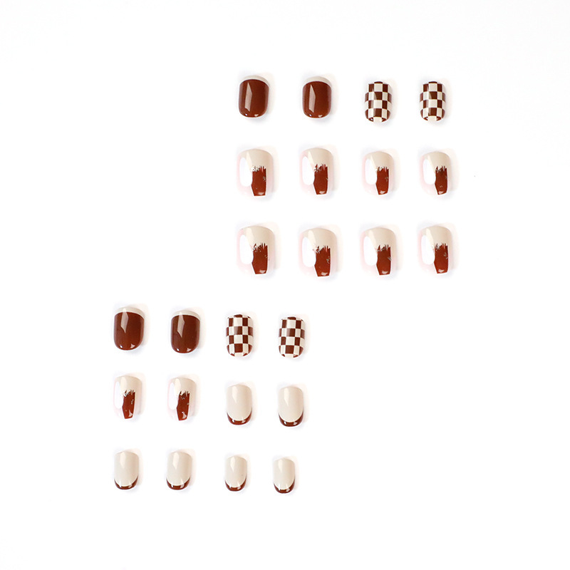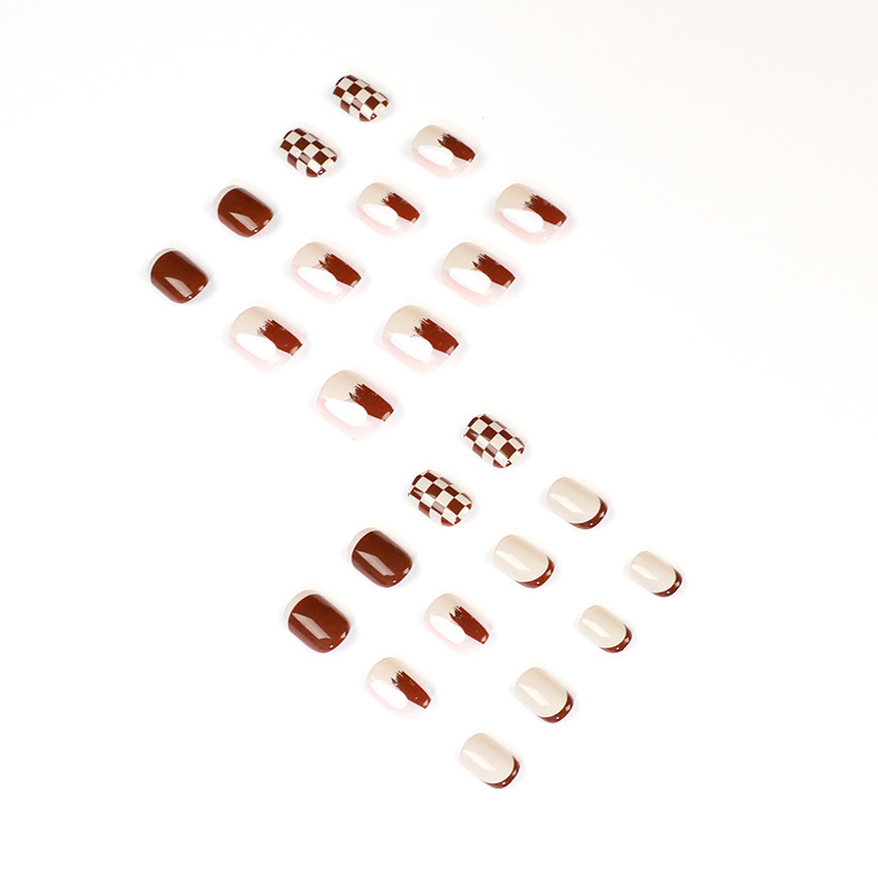 短款法式棋盘格穿戴甲奶油拿铁美甲假指甲贴片成品甲片