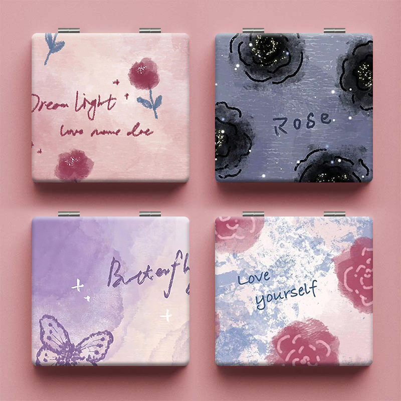水墨画玫瑰花便携化妆小镜子韩国随身双面折叠镜正方形手 持补妆