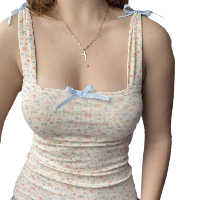 夏季甜美风低方领碎花小吊带女撞色修身蝴蝶结拼接显瘦短上衣