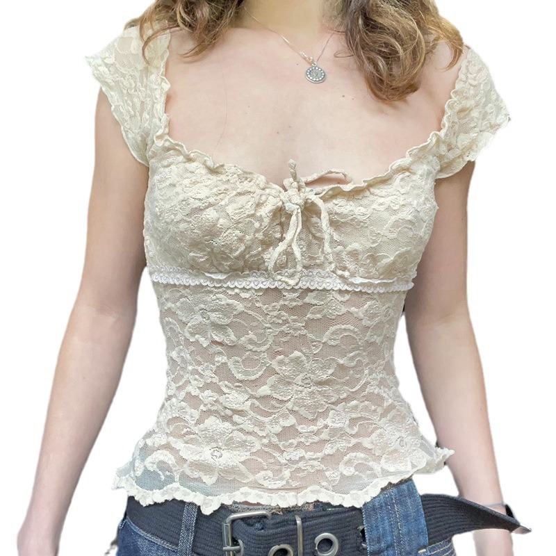 法式甜美风褶皱花边方领泡泡袖T恤绑带胸型收腰透视蕾丝上衣