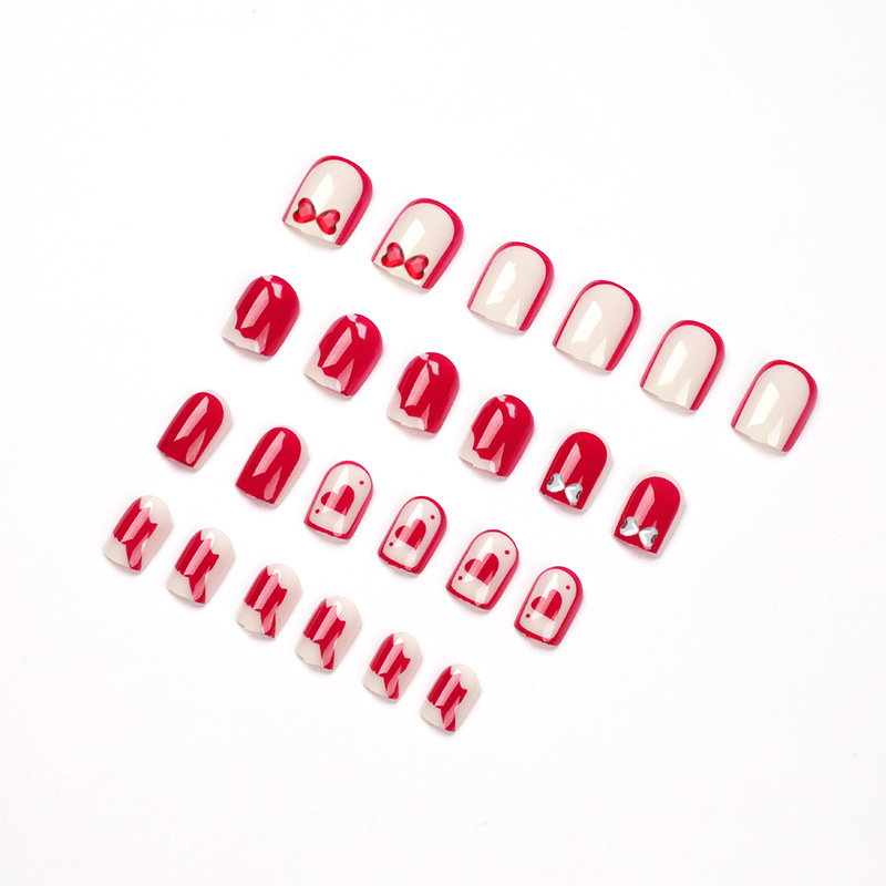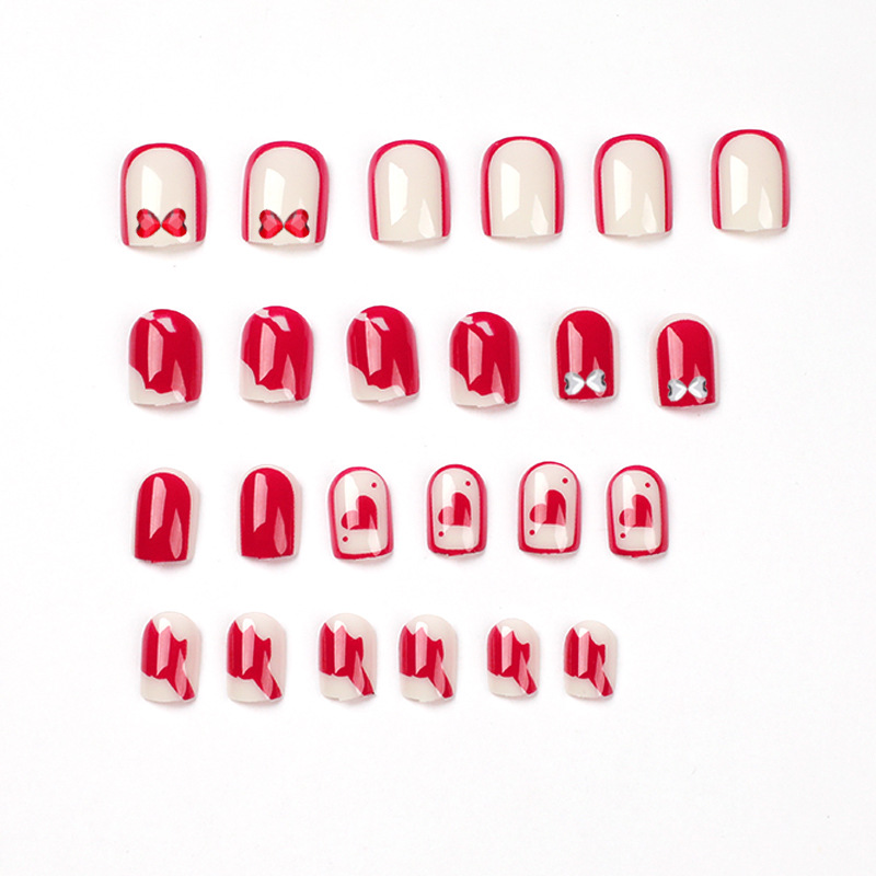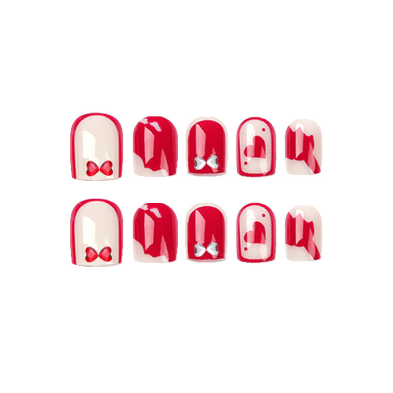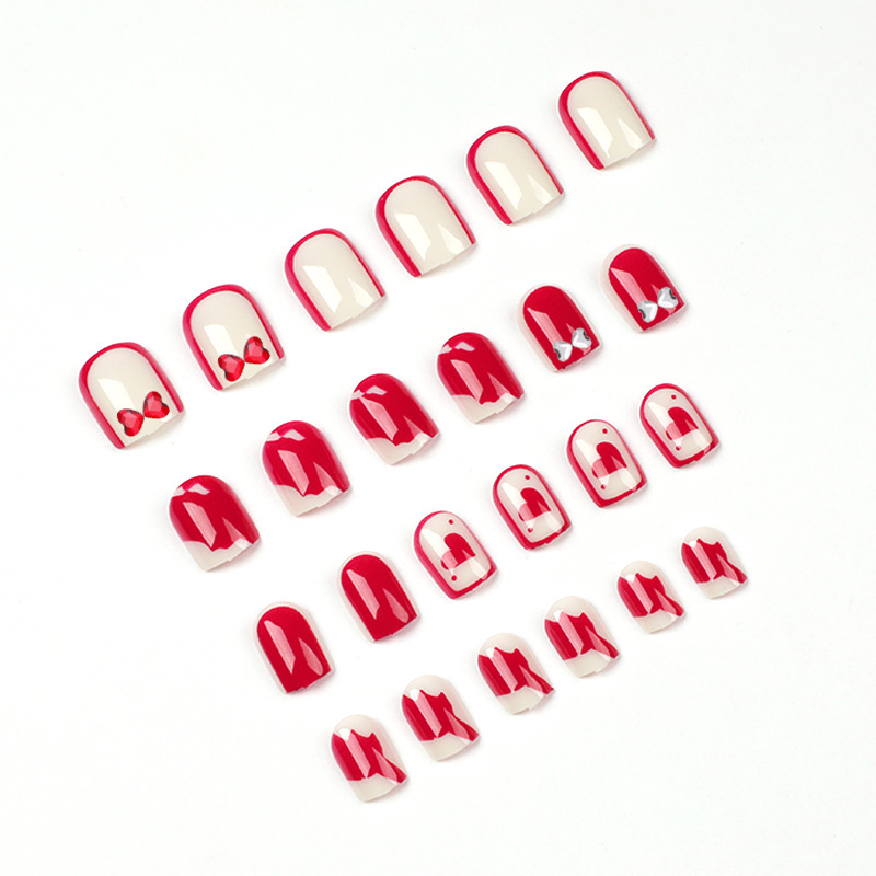 穿戴甲红白撞色拼接爱心水钻穿戴美甲秋日穿戴甲蝴蝶结穿戴甲