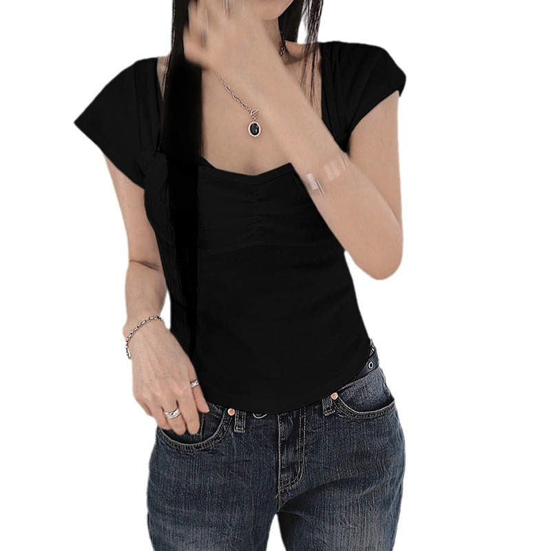 欧美风新款纯色方领褶皱不规则短袖T恤辣妹修身轻薄短上衣