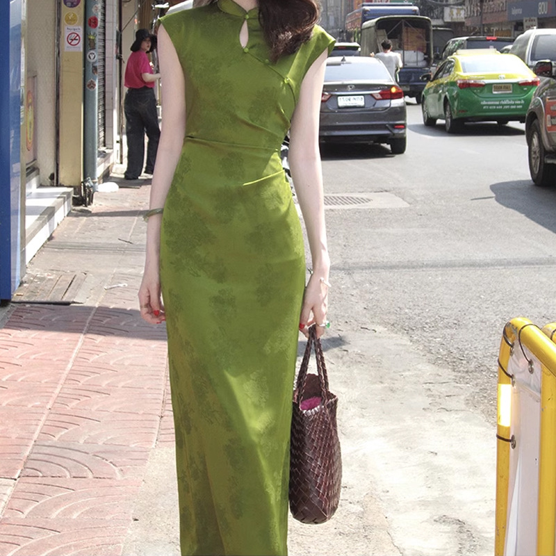 新中式两色提花显瘦显白旗袍连衣裙立领夏季