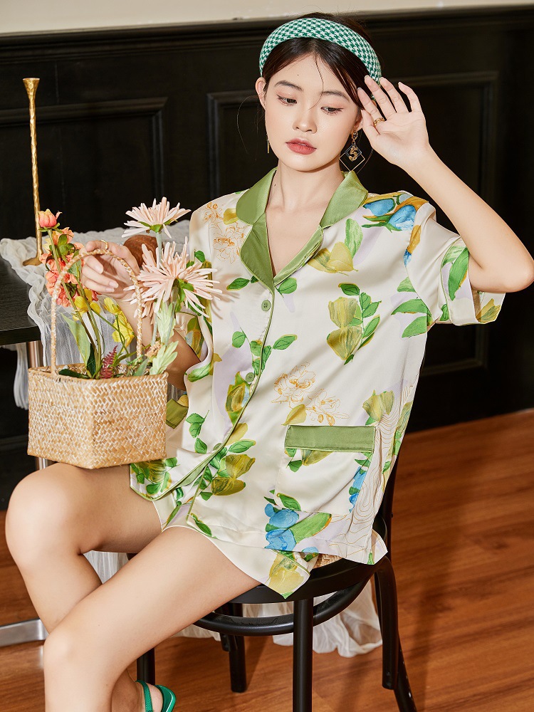 印花睡衣女夏款冰丝两件套可外穿短袖短裤套装薄款丝绸家居服宽松