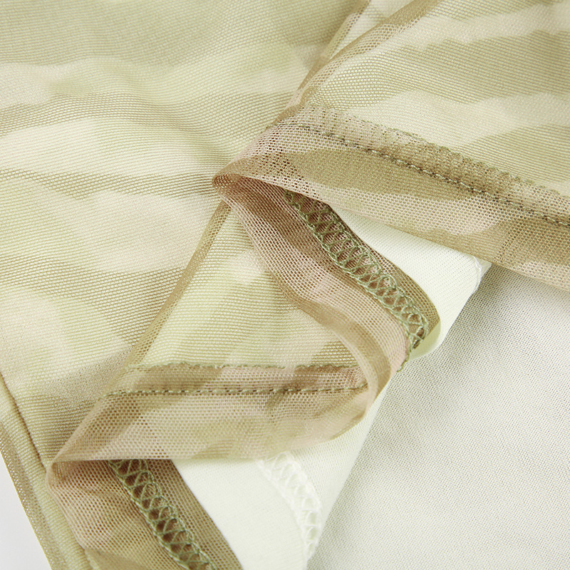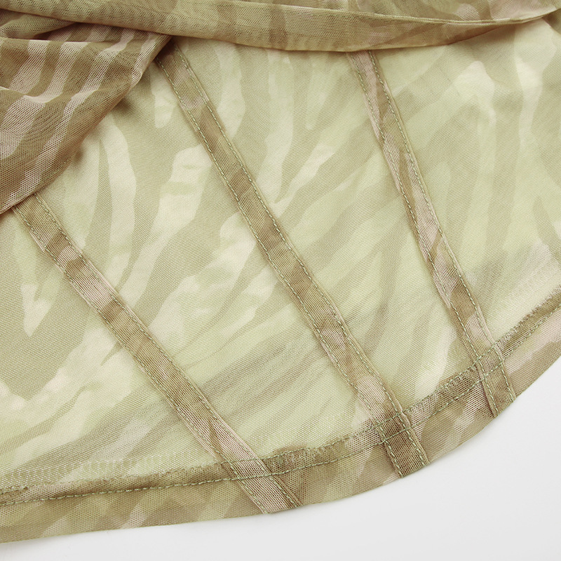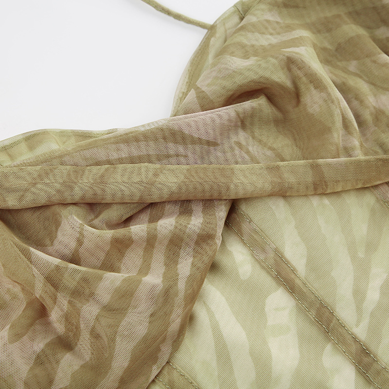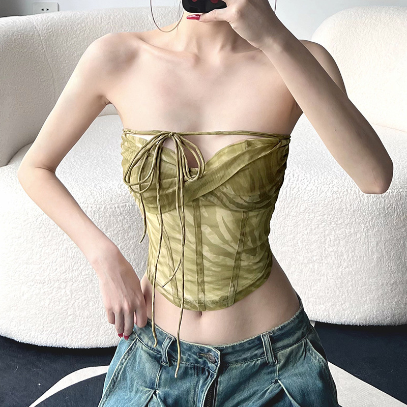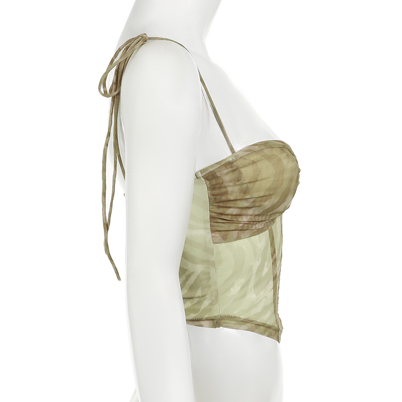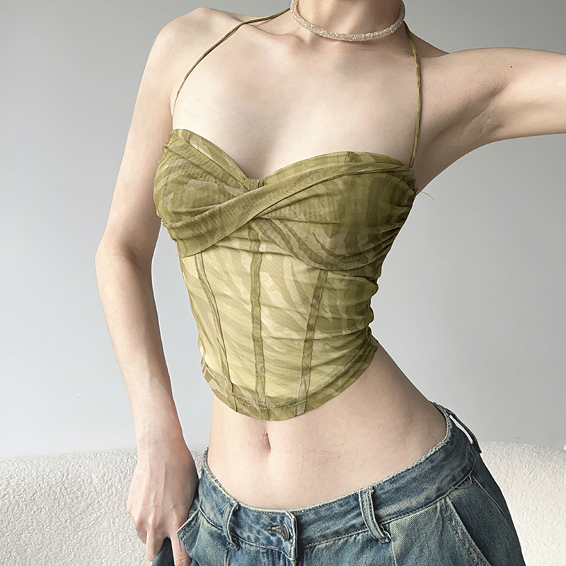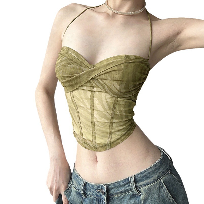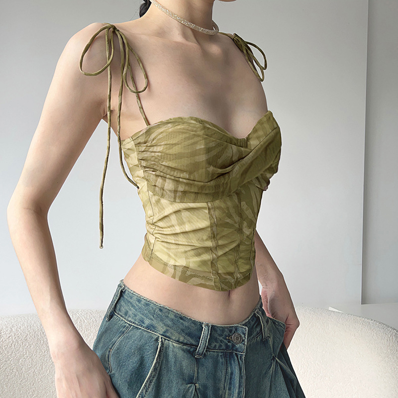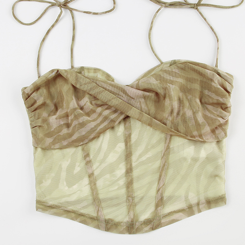 欧美风扭结褶皱波纹双层网纱印花抹胸吊带鱼骨束腰不规则上衣