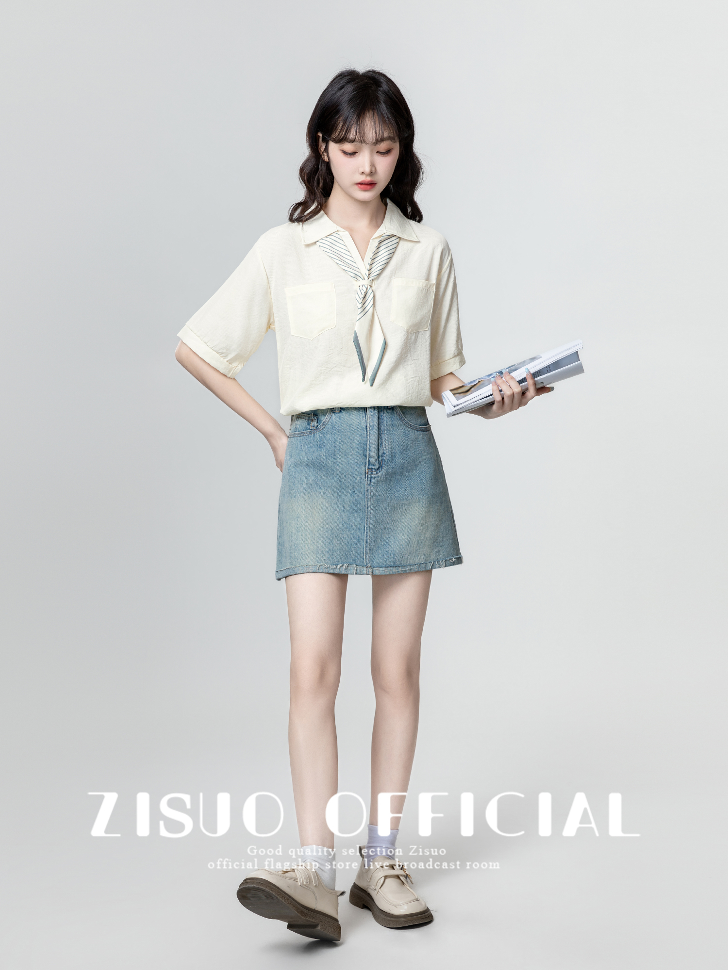 杏色短袖衬衫女2025夏季新款带领带polo领衬衣宽松设计感小众上衣