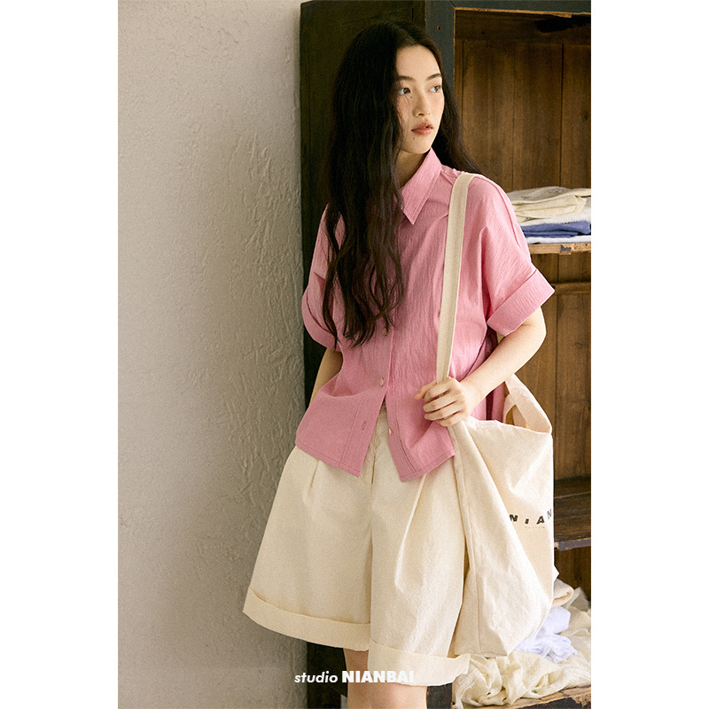 绉感肌理经典宽门襟短款翻边短袖衬衫NC3086