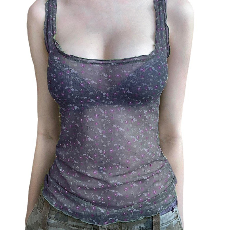 度假小清新绿色碎花网纱小吊带女木耳边方领透视外穿背心上衣