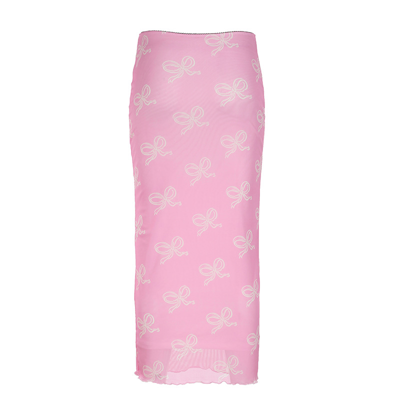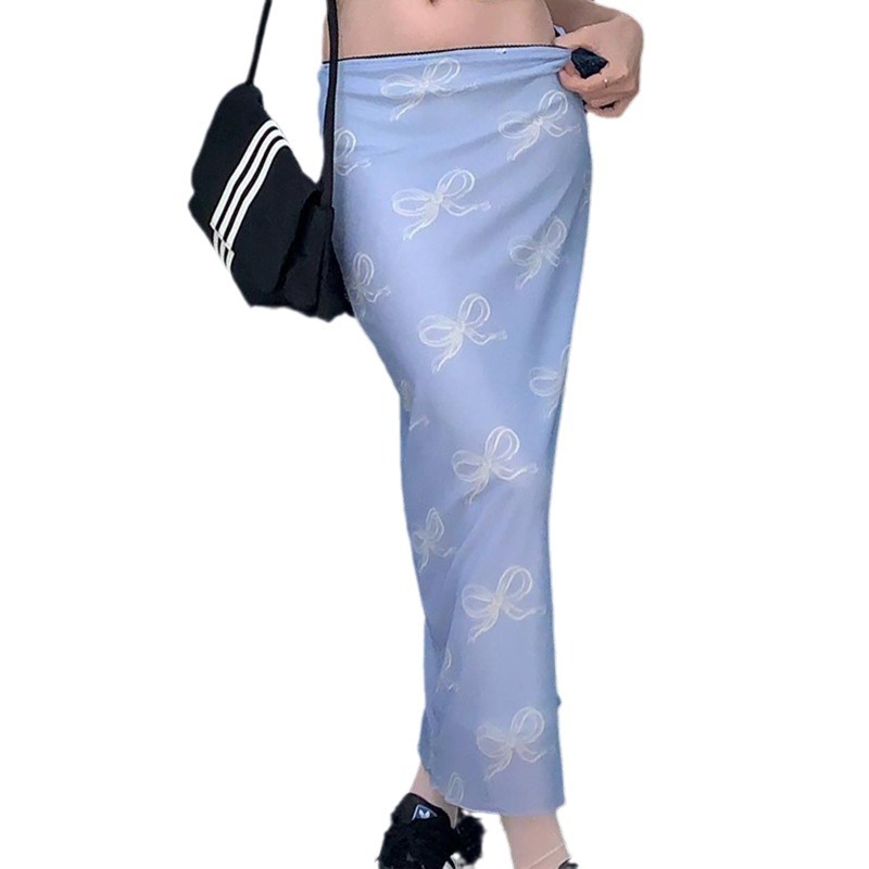 春夏复古风蝴蝶结印花低腰显瘦半裙少女减龄撞色修身网纱长裙