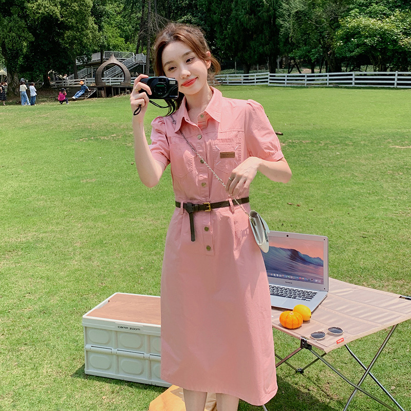韩版时尚减龄工装气质翻领系带收腰显瘦衬衫裙温柔休闲短款连衣裙