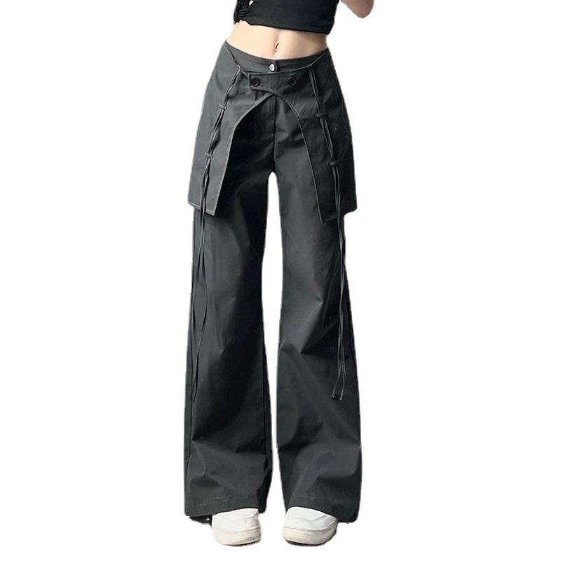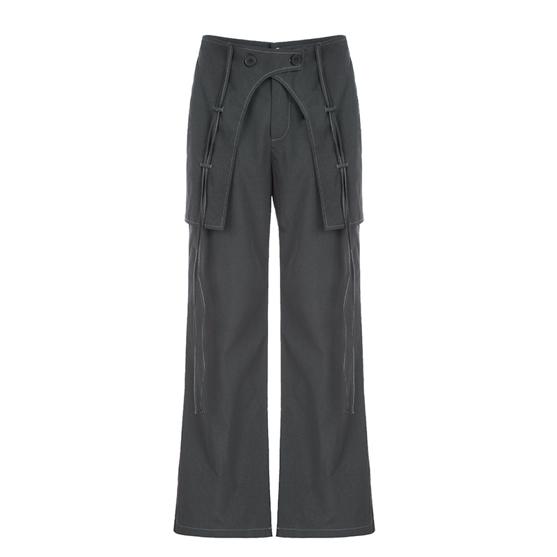 欧美街头风潮人设计感交叉飘带休闲直筒裤高腰梭织基础纽扣工装裤
