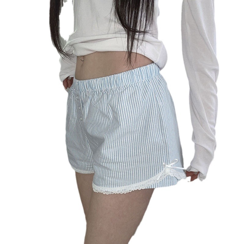 跨境新款蕾丝拼接低腰排扣条纹居家短裤撞色显瘦宽松休闲裤女
