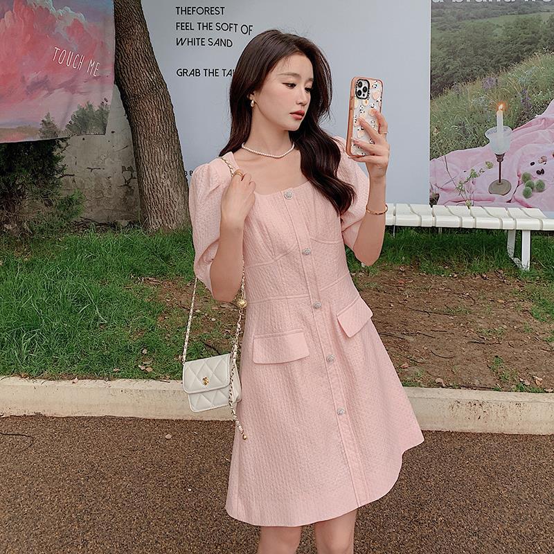 粉色小香风连衣裙女夏气质精致轻奢高级感端庄大气方领显瘦a字裙