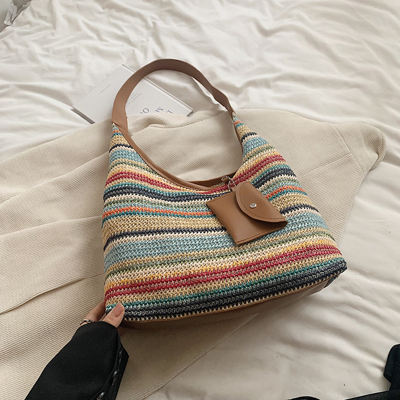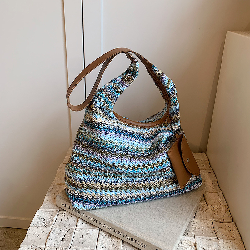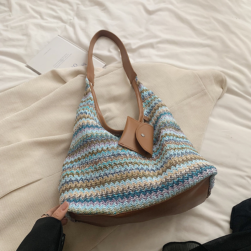 夏天大容量彩虹草编包包女新款时尚通勤单肩包手提子母托特包