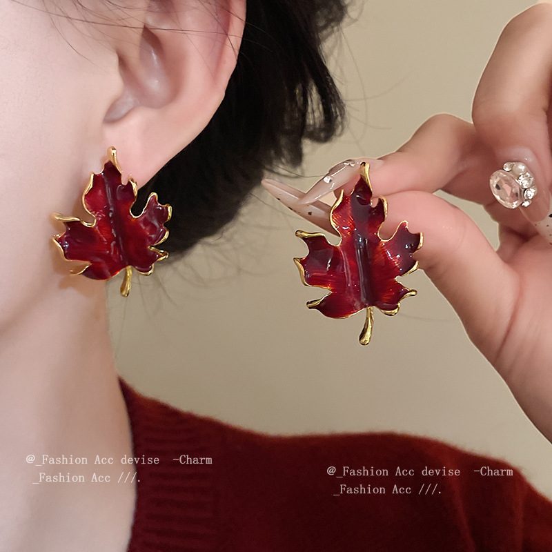 银针滴油枫叶耳钉港风复古设计耳环高级感时尚气质耳饰