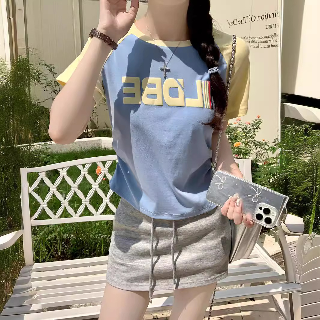 撞色插肩短袖T恤女多巴胺穿搭甜美小众设计感收腰显瘦短款上衣夏