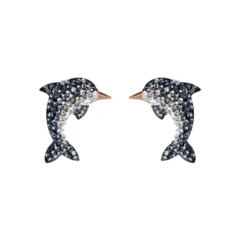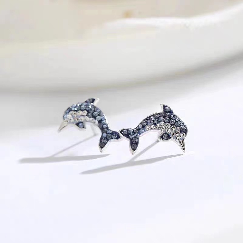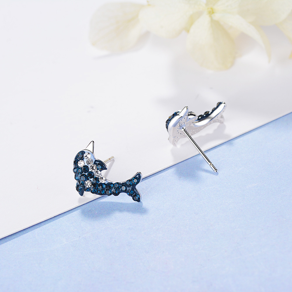 s925纯银蓝色海豚耳钉女清新甜美渐变色镶钻耳环气质森系