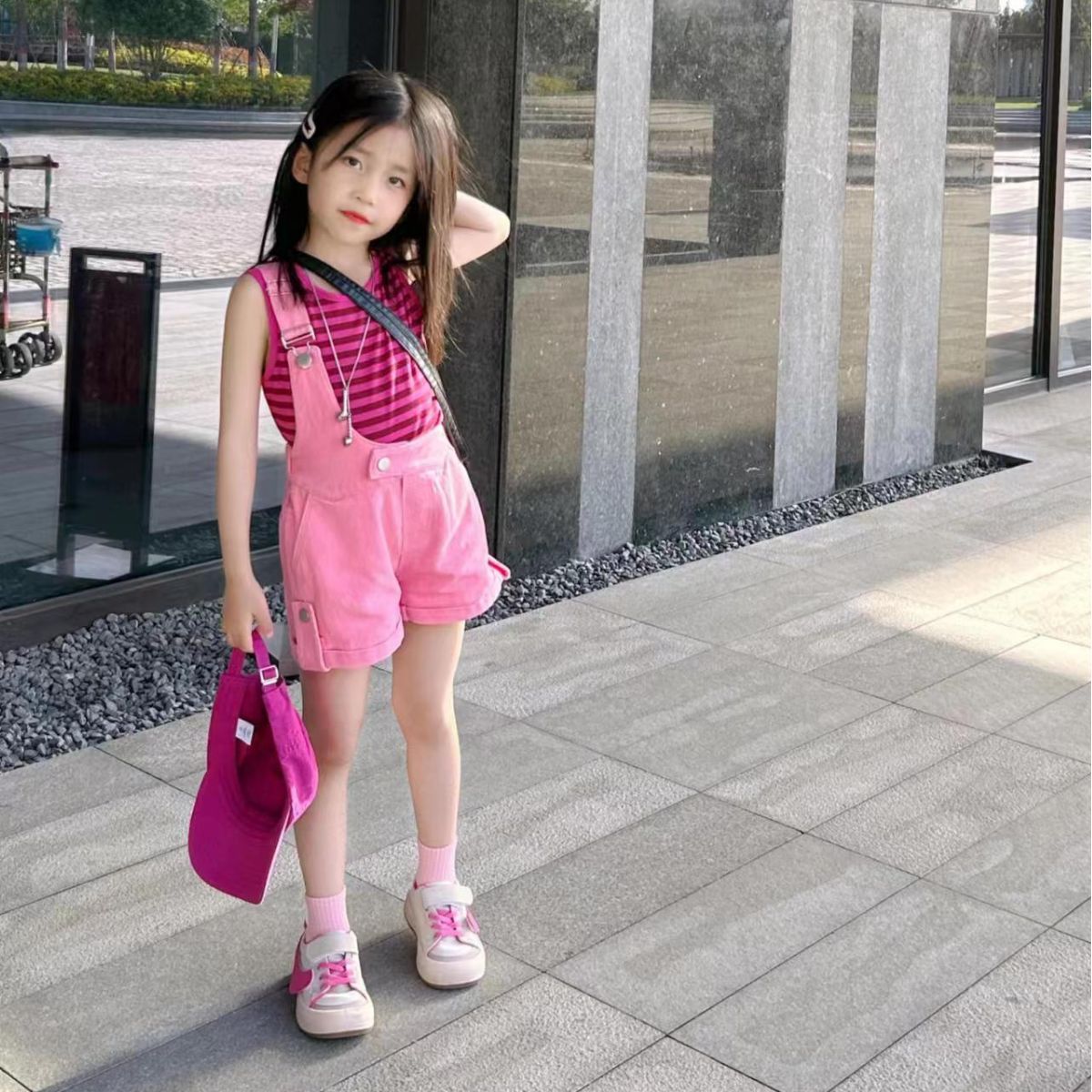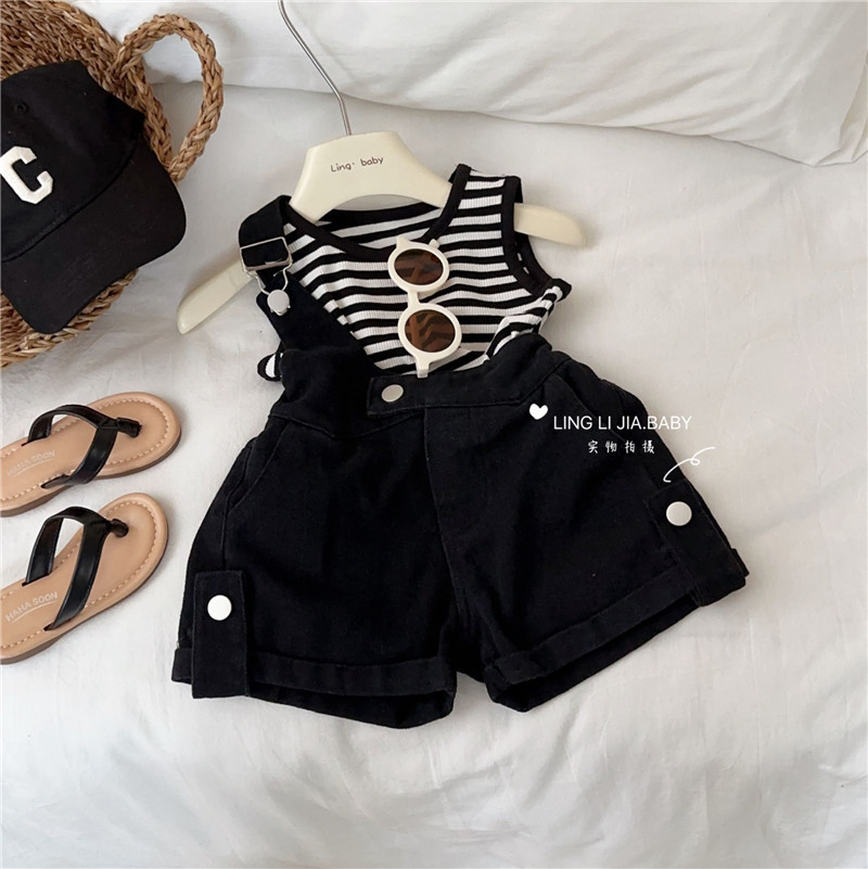夏季女童套装宝宝洋气儿童个性潮韩版条纹背心上衣不规则背带短裤